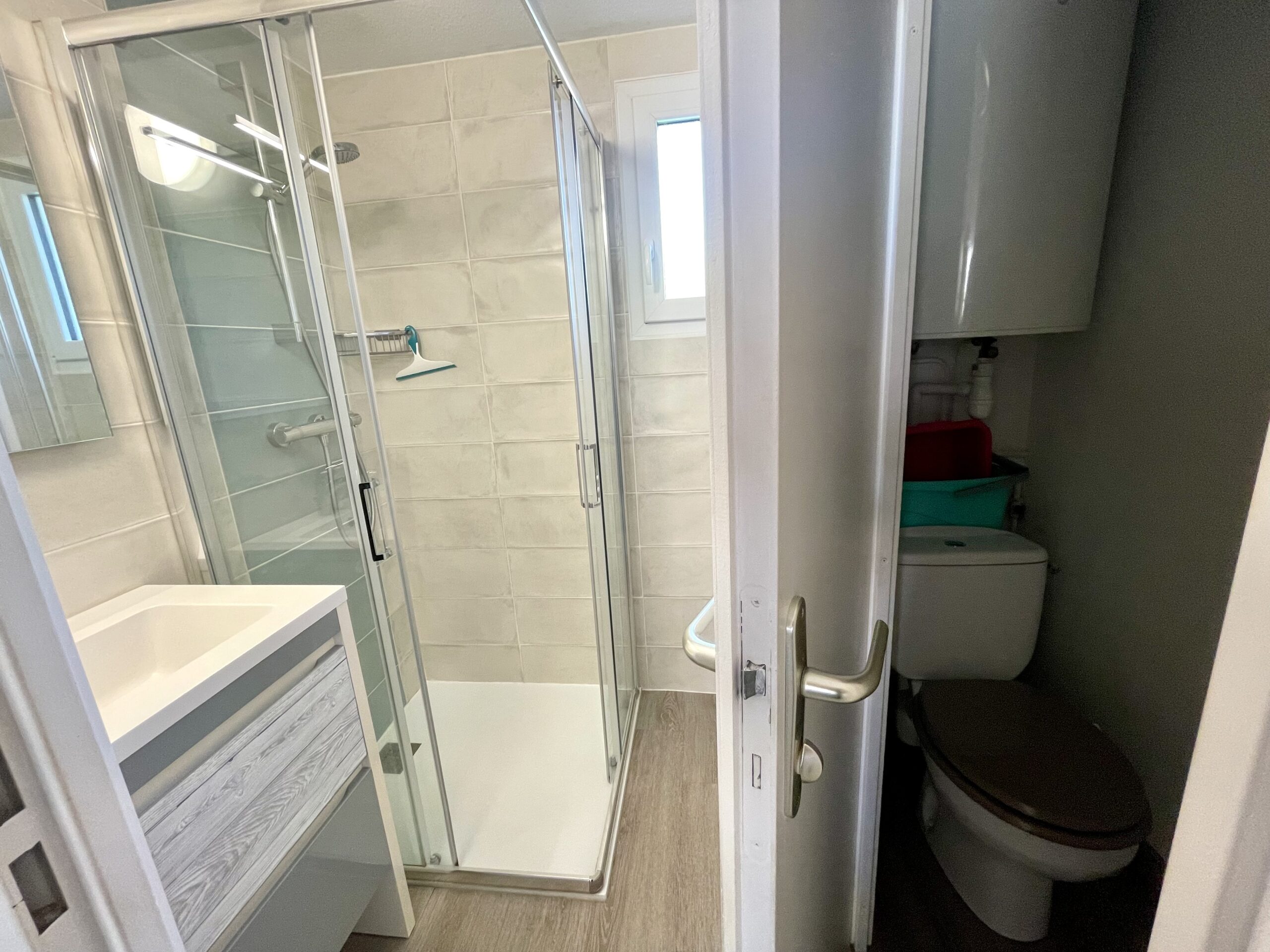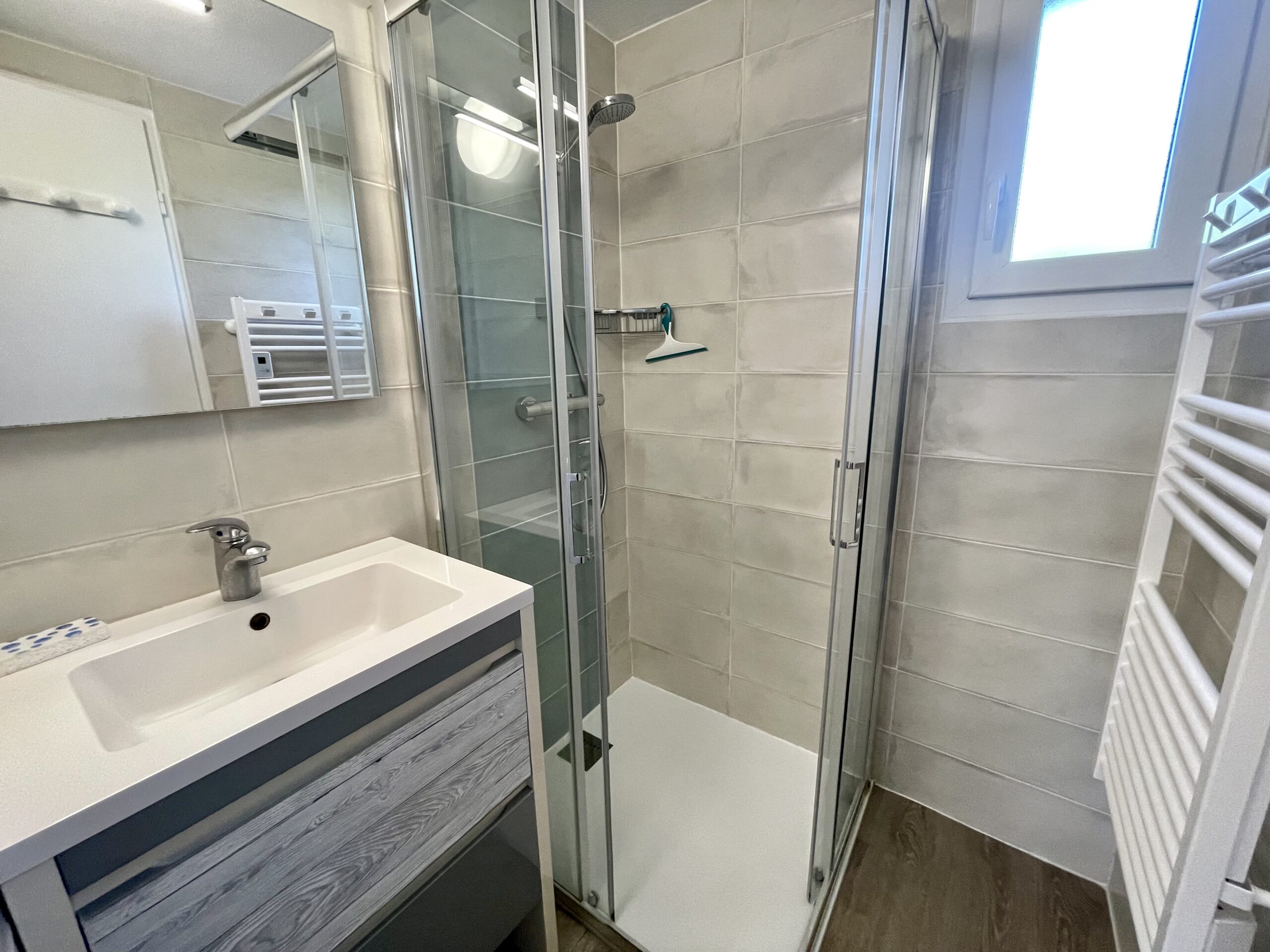 Une salle d’eau (douche, meuble vasque, sèche-serviette) avec WC à l’intérieur (mais séparé par une porte).