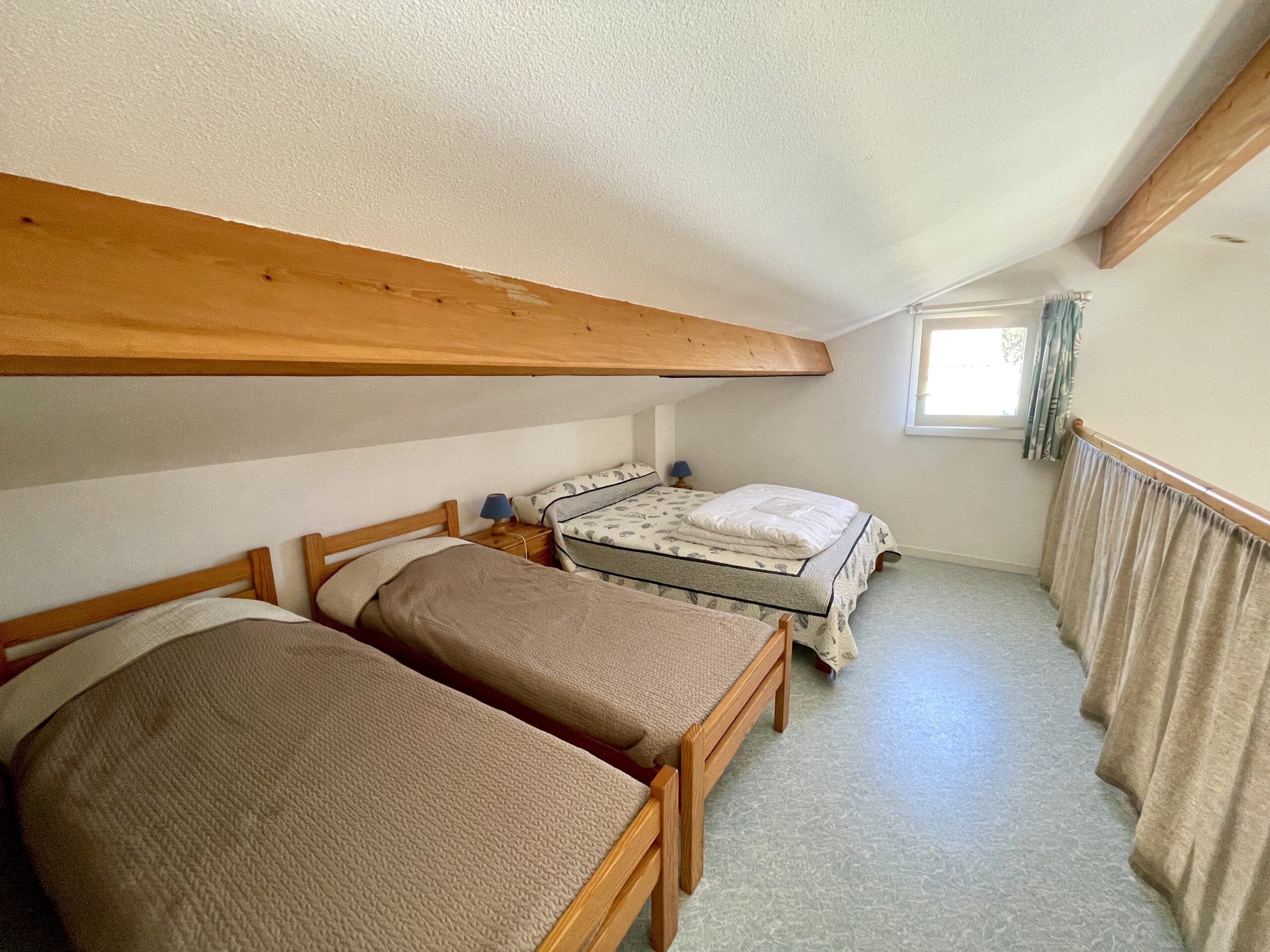 A l’étage: mezzanine (sous rampants) ouverte sur séjour avec 2 lits simples (2×80 cm / couvertures & oreillers carrés) et un lit double (140 cm / couette & oreillers carrés)+ rangement.
