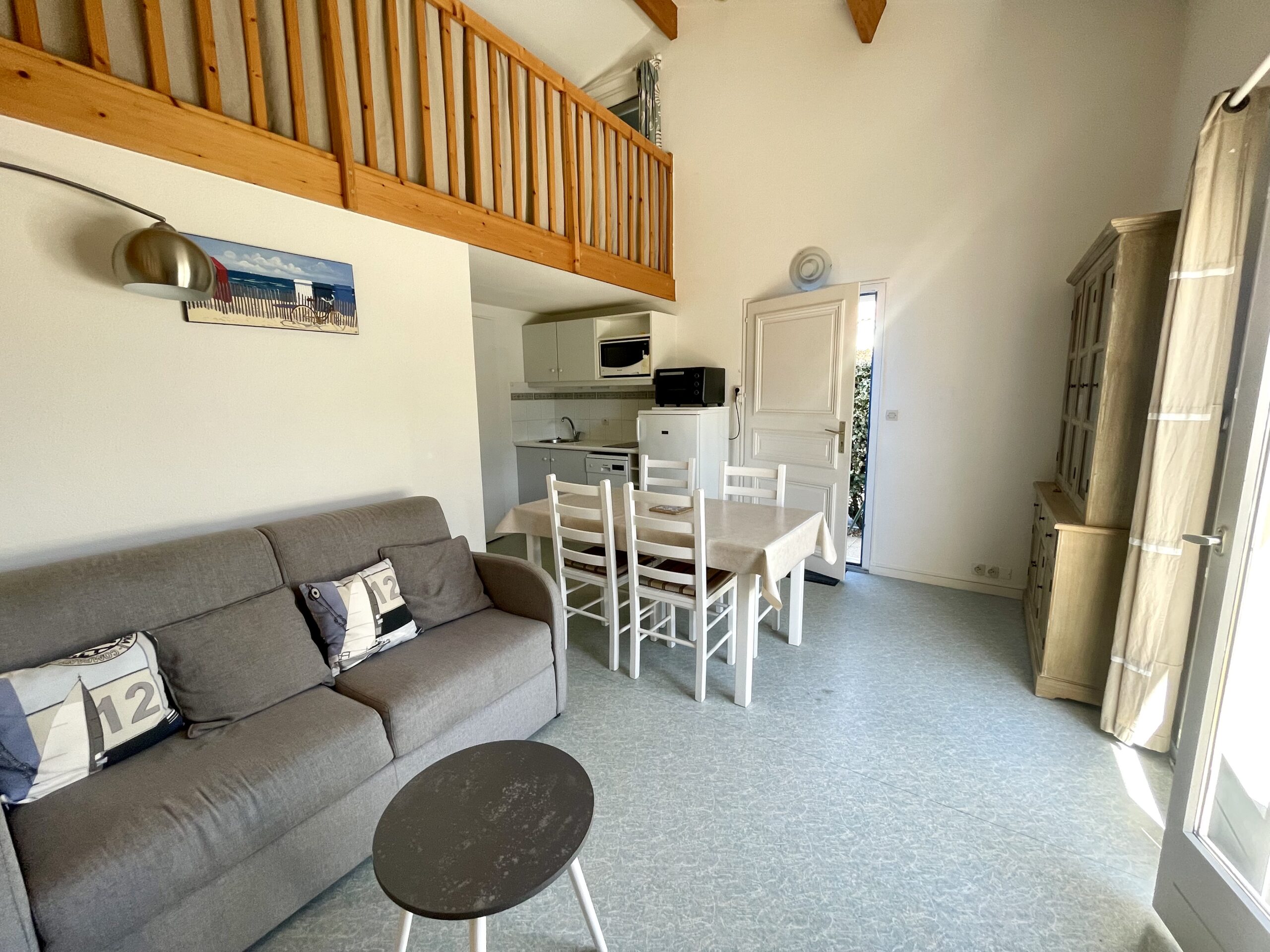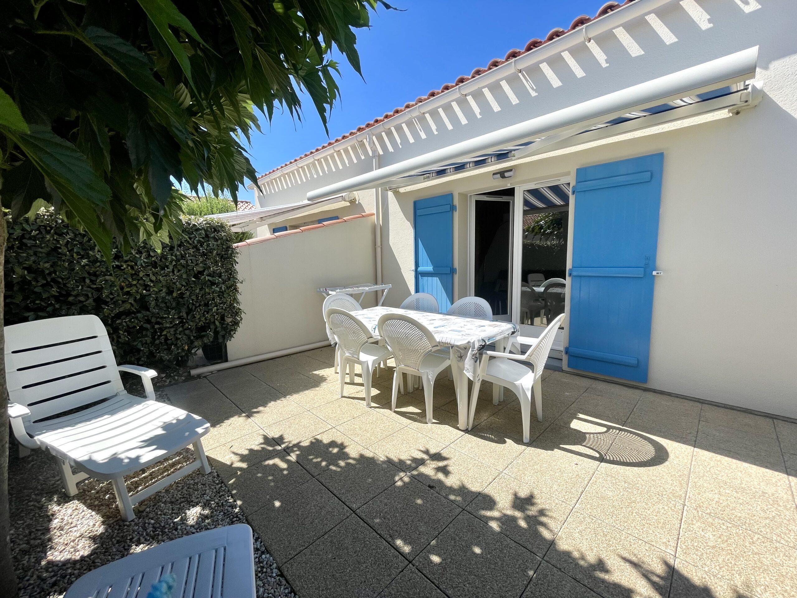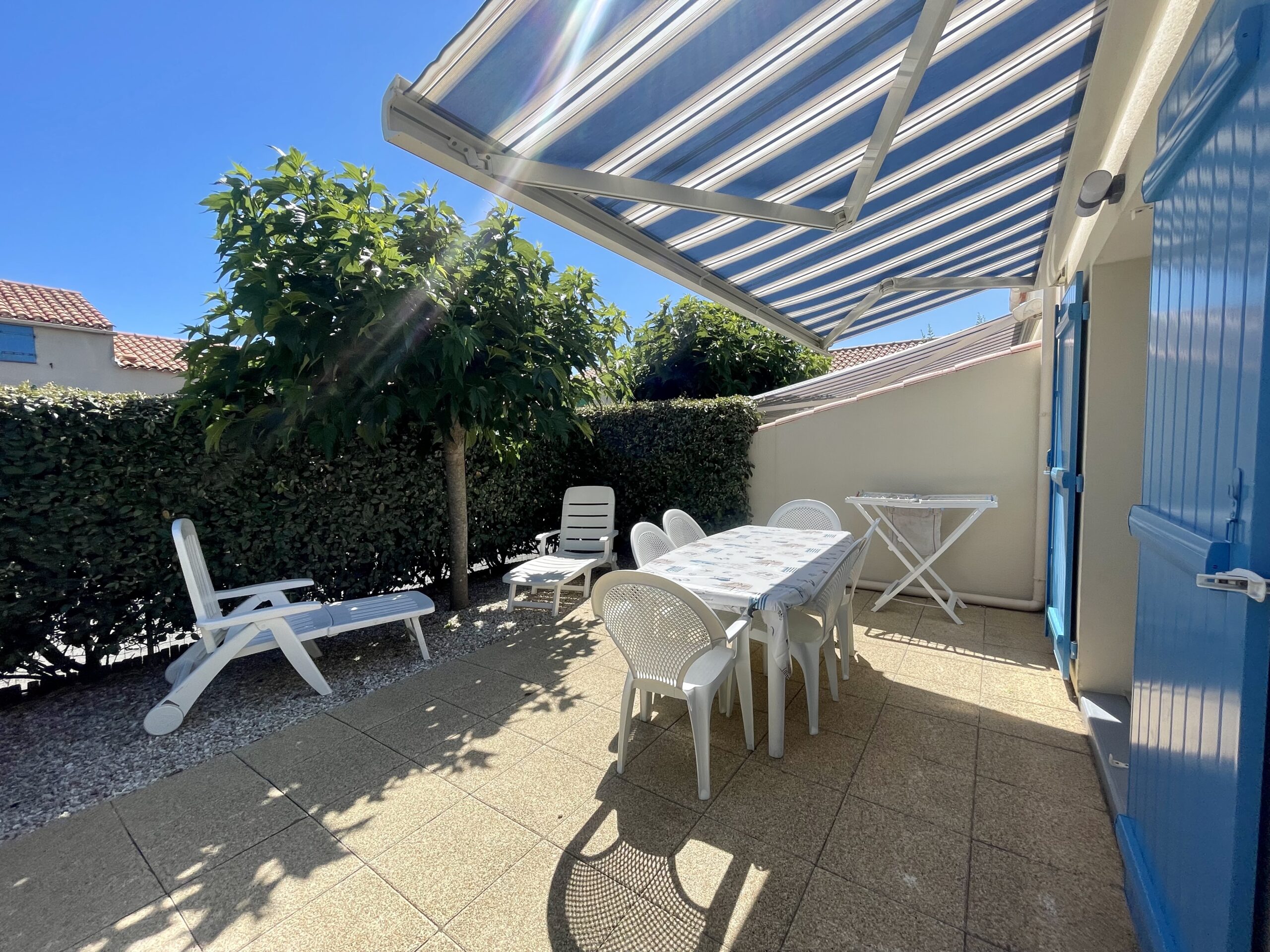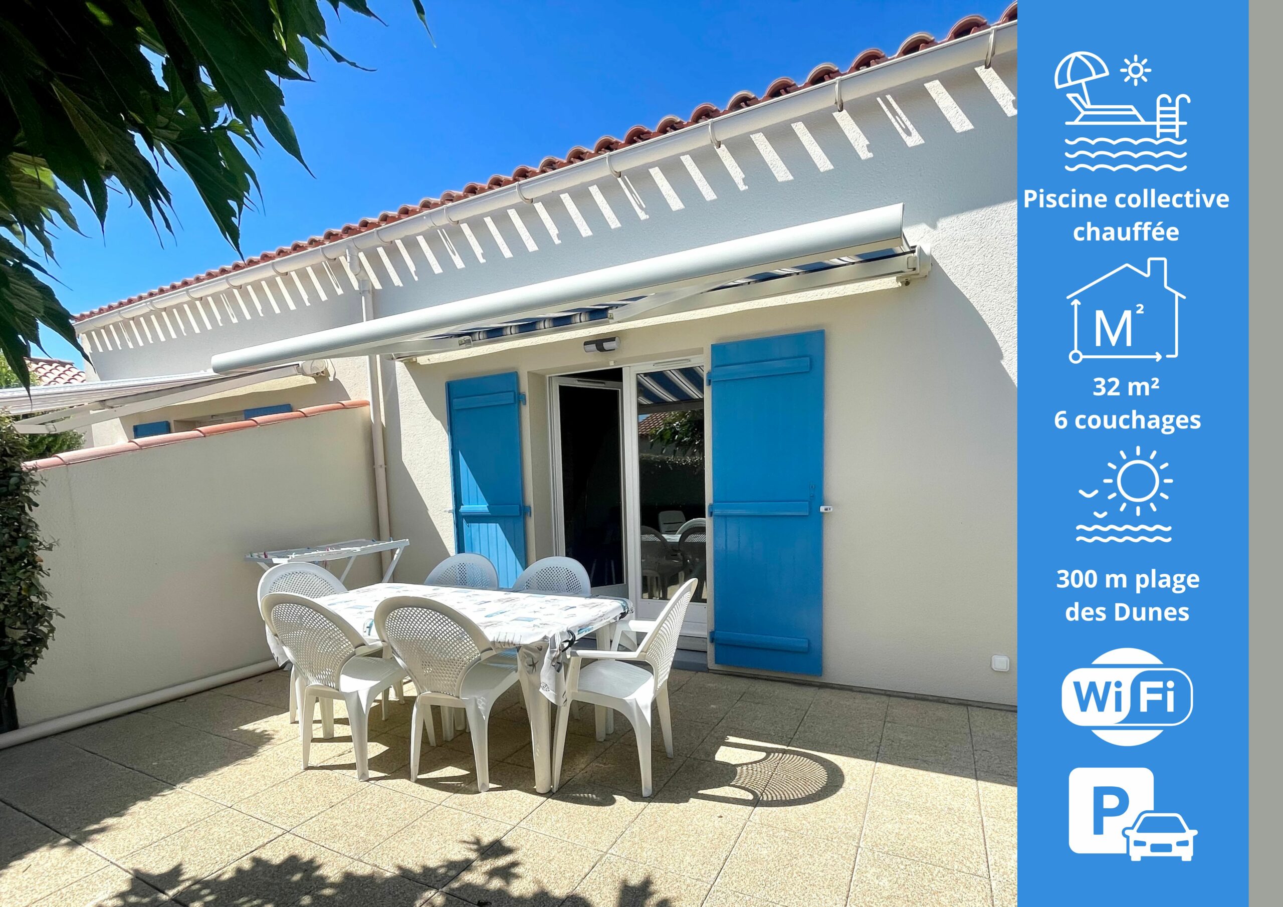 A 300m de la plage des Dunes par accès direct, dans résidence avec piscine chauffée (ouverte entre mi-juin et mi septembre) et tennis collectifs, jolie maison avec jardinet clos comprenant: une entrée directe dans le séjour (canapé, buffet, TV, table, chaises), un coin-cuisine (plaques induction 2 feux, micro-ondes, minifour, grand réfrigérateur, lave-vaisselle).