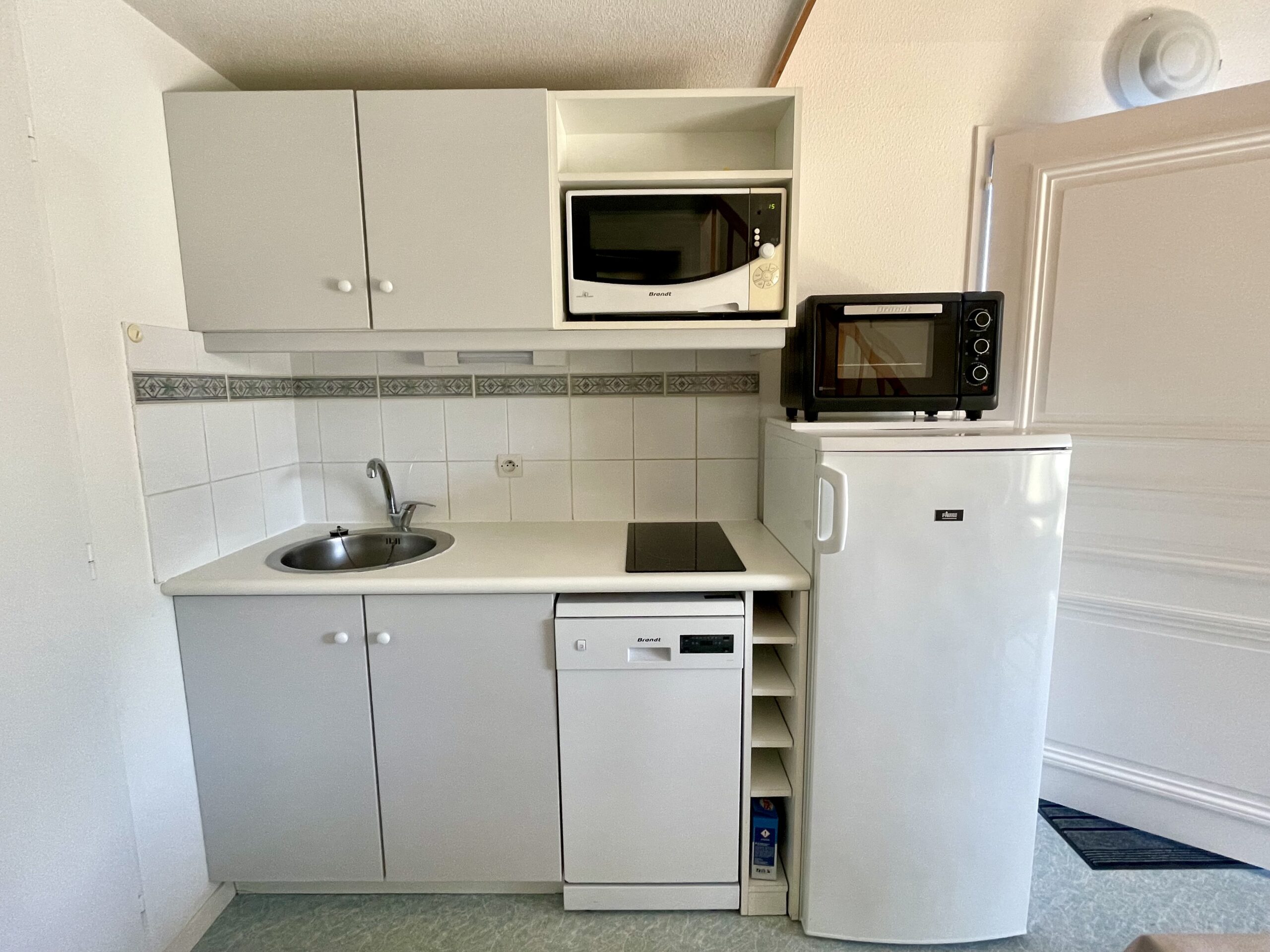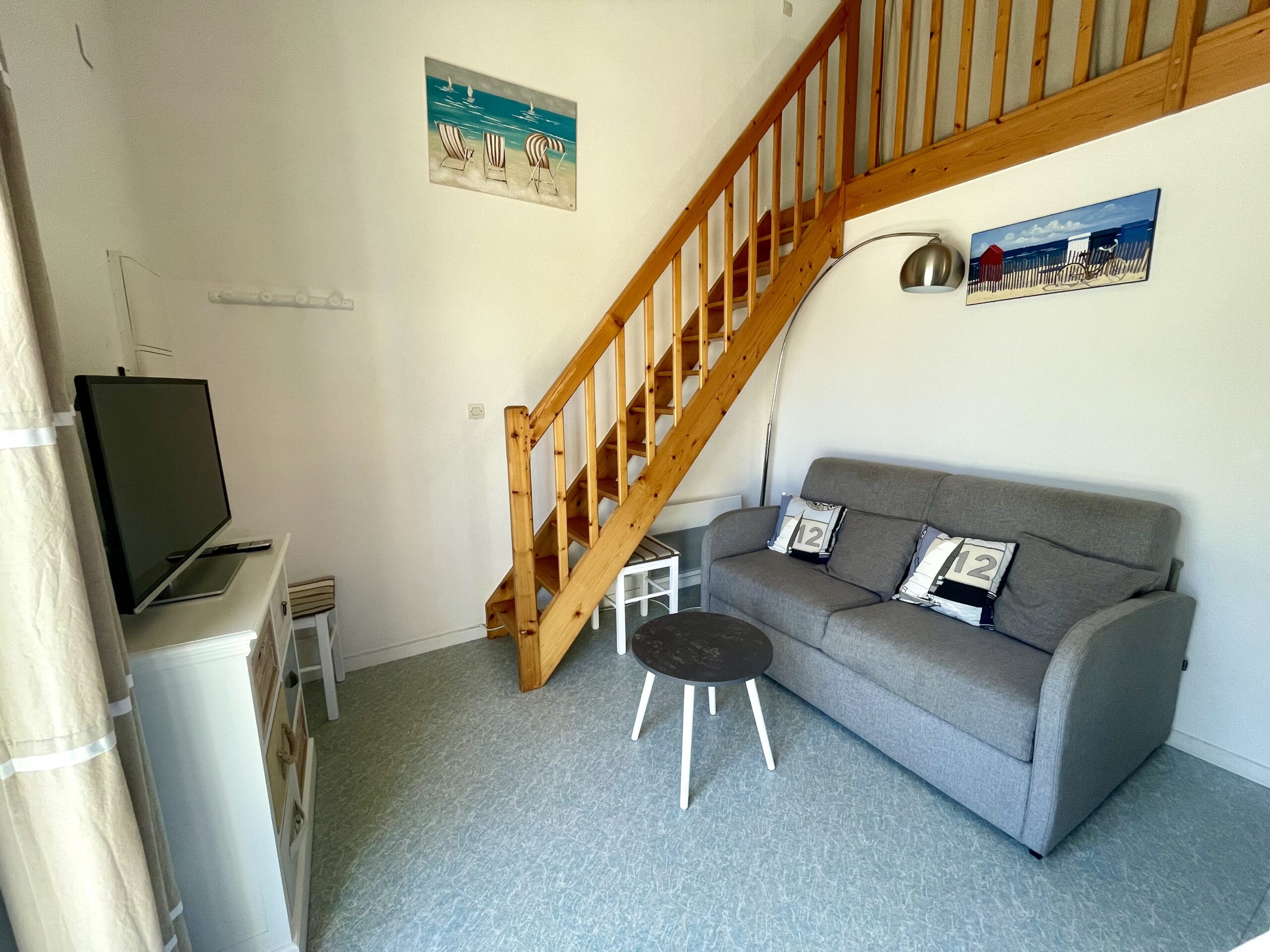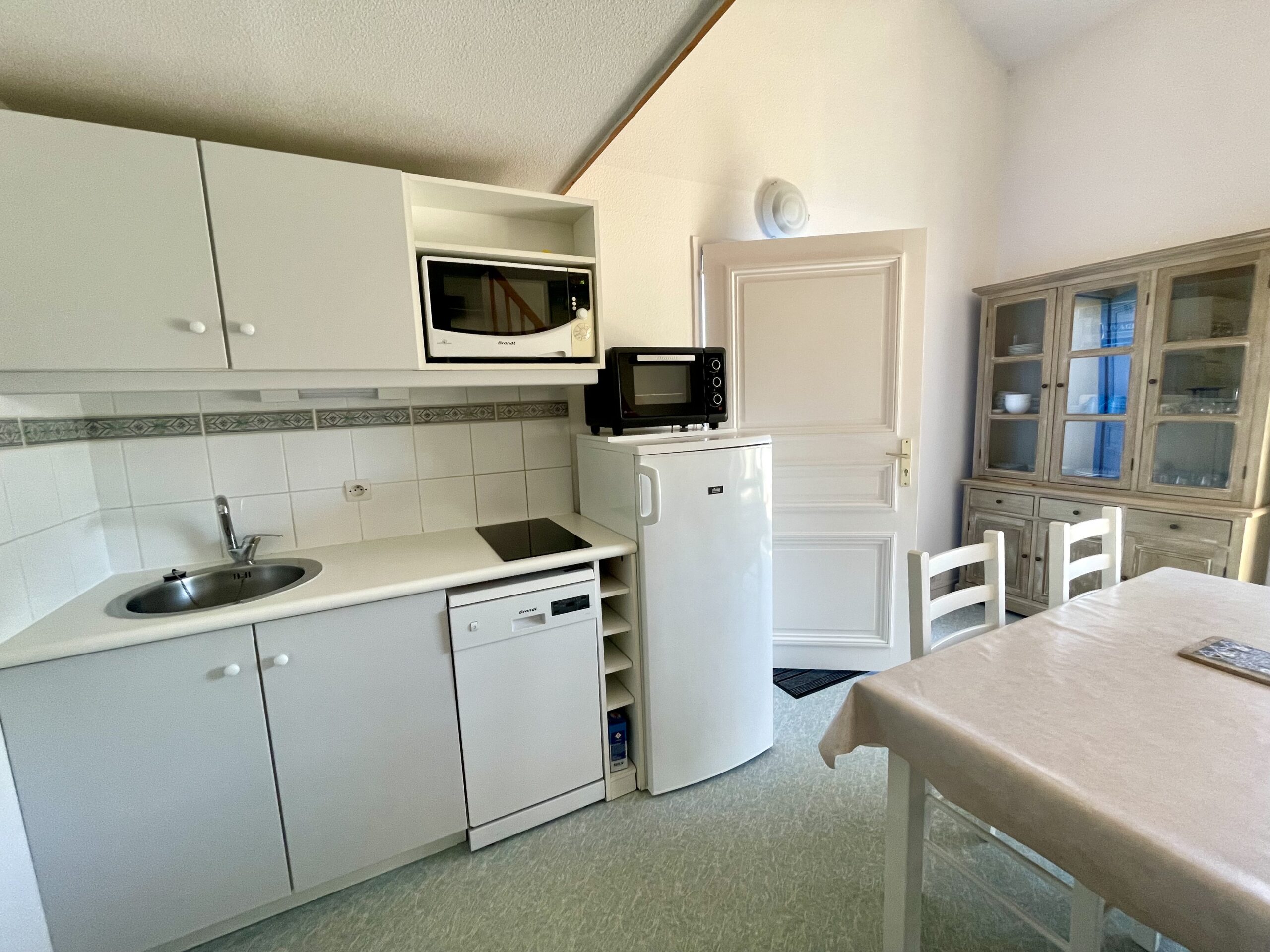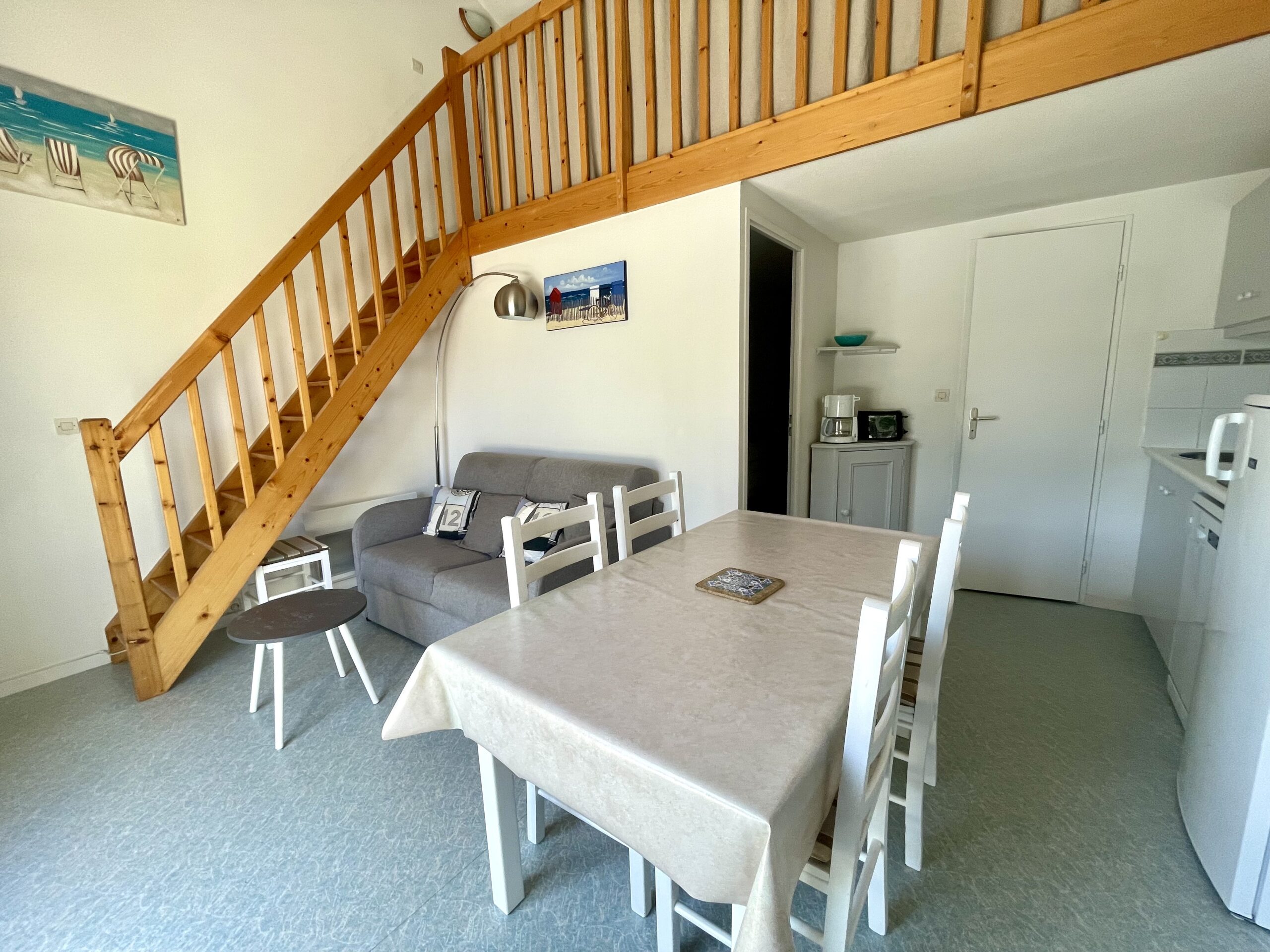 A 300m de la plage des Dunes par accès direct, dans résidence avec piscine chauffée (ouverte entre mi-juin et mi septembre) et tennis collectifs, jolie maison avec jardinet clos comprenant: une entrée directe dans le séjour (canapé, buffet, TV, table, chaises), un coin-cuisine (plaques induction 2 feux, micro-ondes, minifour, grand réfrigérateur, lave-vaisselle).