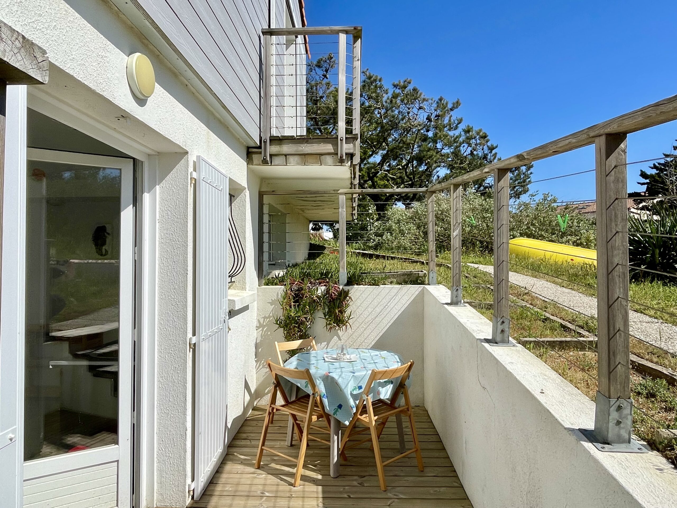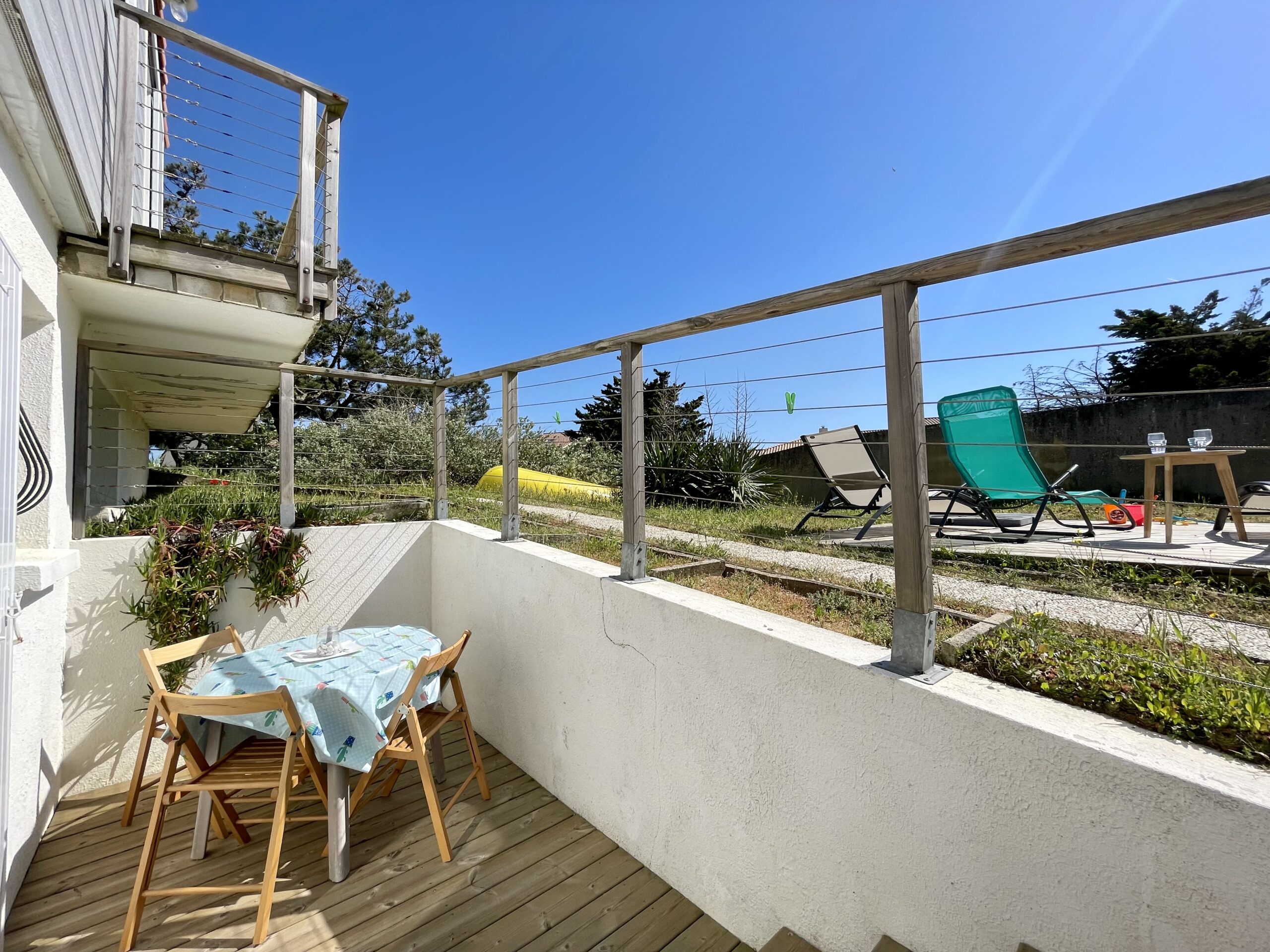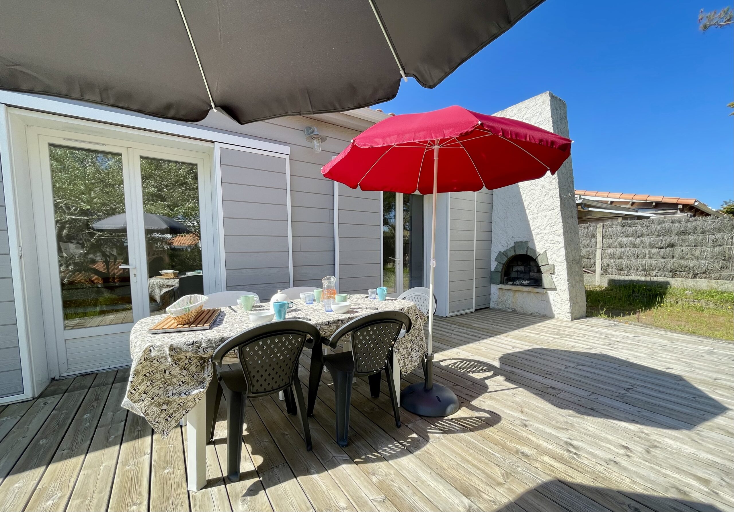 Depuis la pièce de vie ainsi que depuis les 2 chambres, on accède à une agréable terrasse en bois (table, chaises, barbecue, bains de soleil).