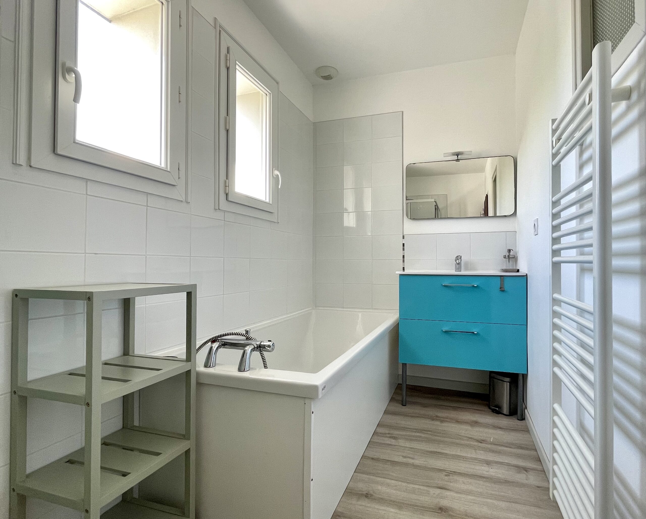 Un dégagement dessert 2 chambres, un toilette séparé et une salle de bain (baignoire + douche, meuble vasque et sèche serviette).