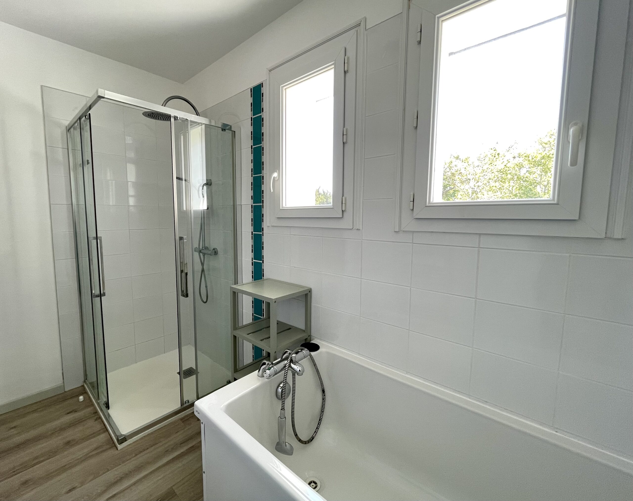 2 chambres (1 x 140 cm + placard et 2 x 90 cm), un toilette séparé et une salle d’eau (meuble vasque, douche et sèche serviette).
