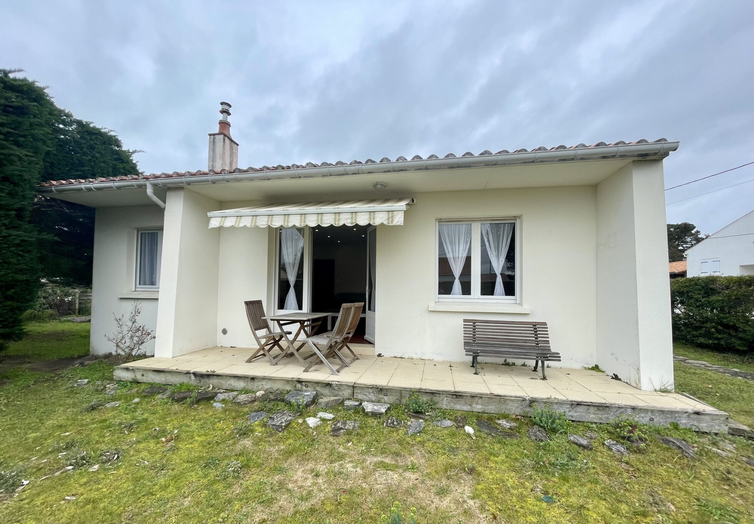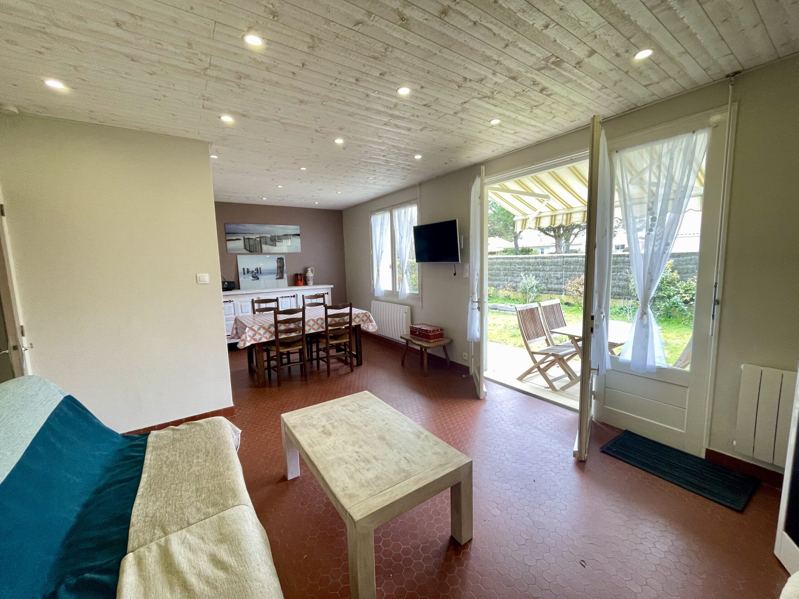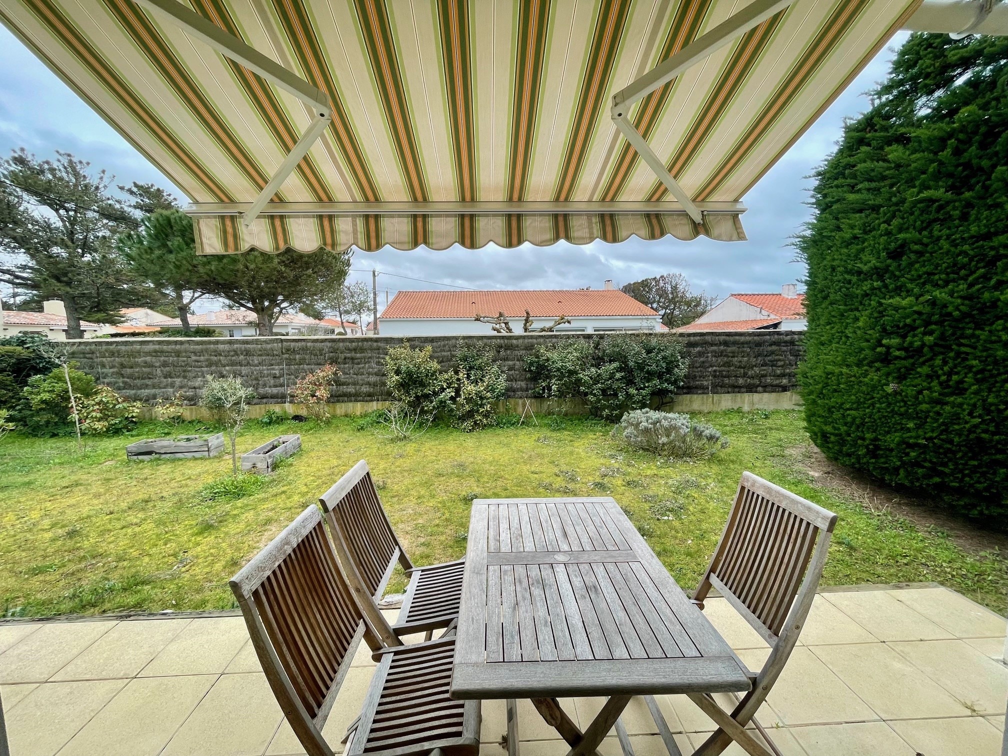 La pièce de vie ouvre sur une terrasse avec salon de jardin + store banne et jardin clos.