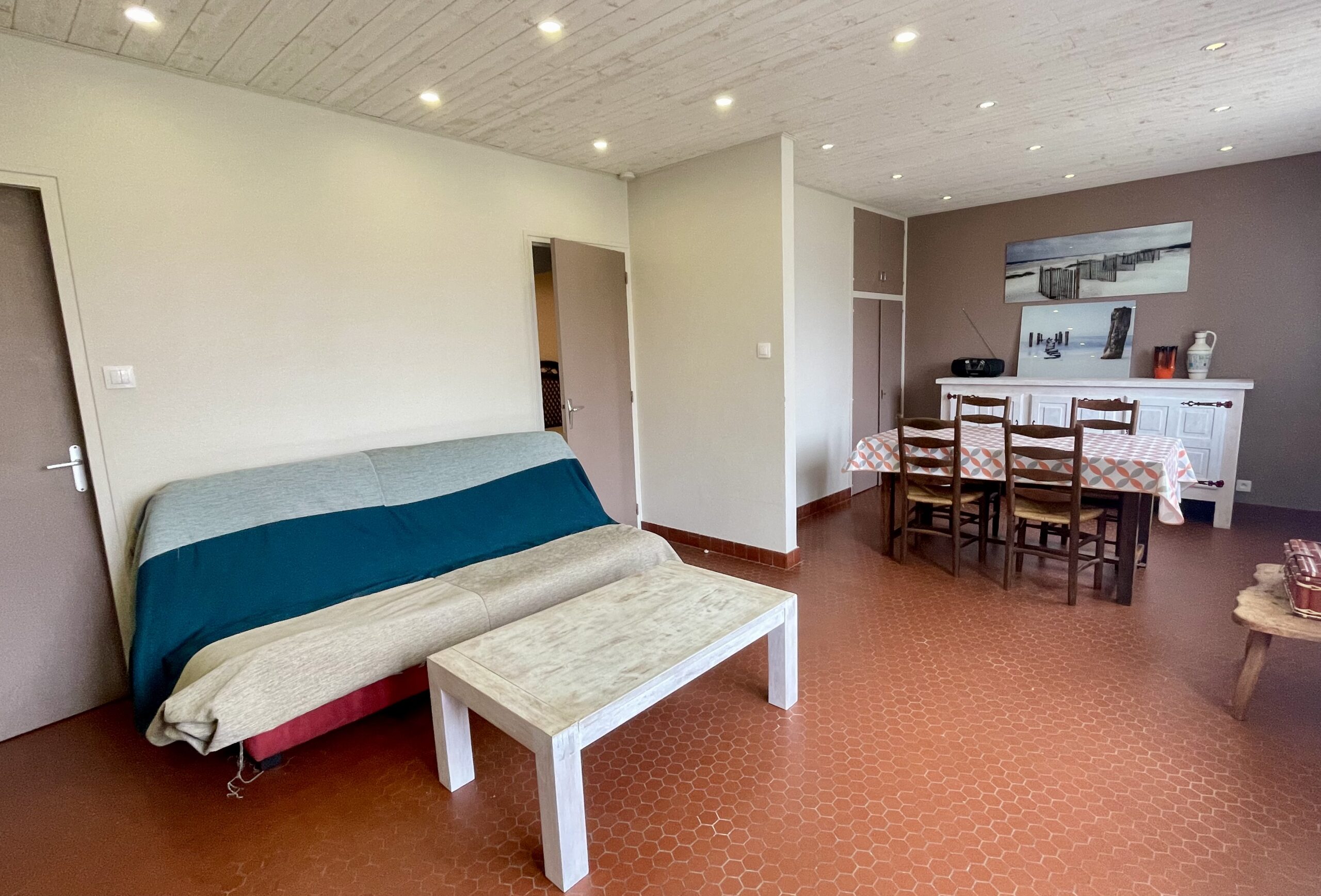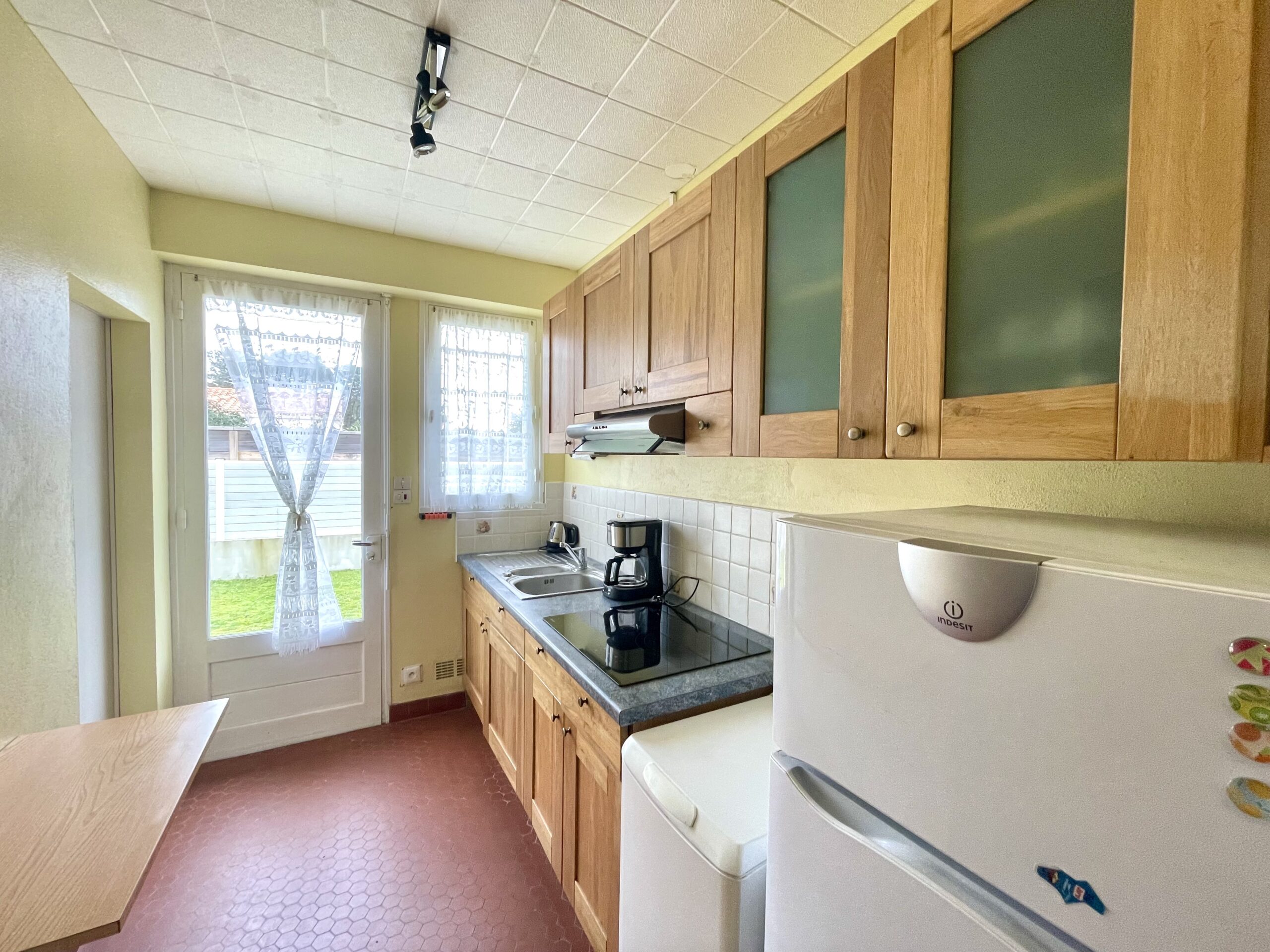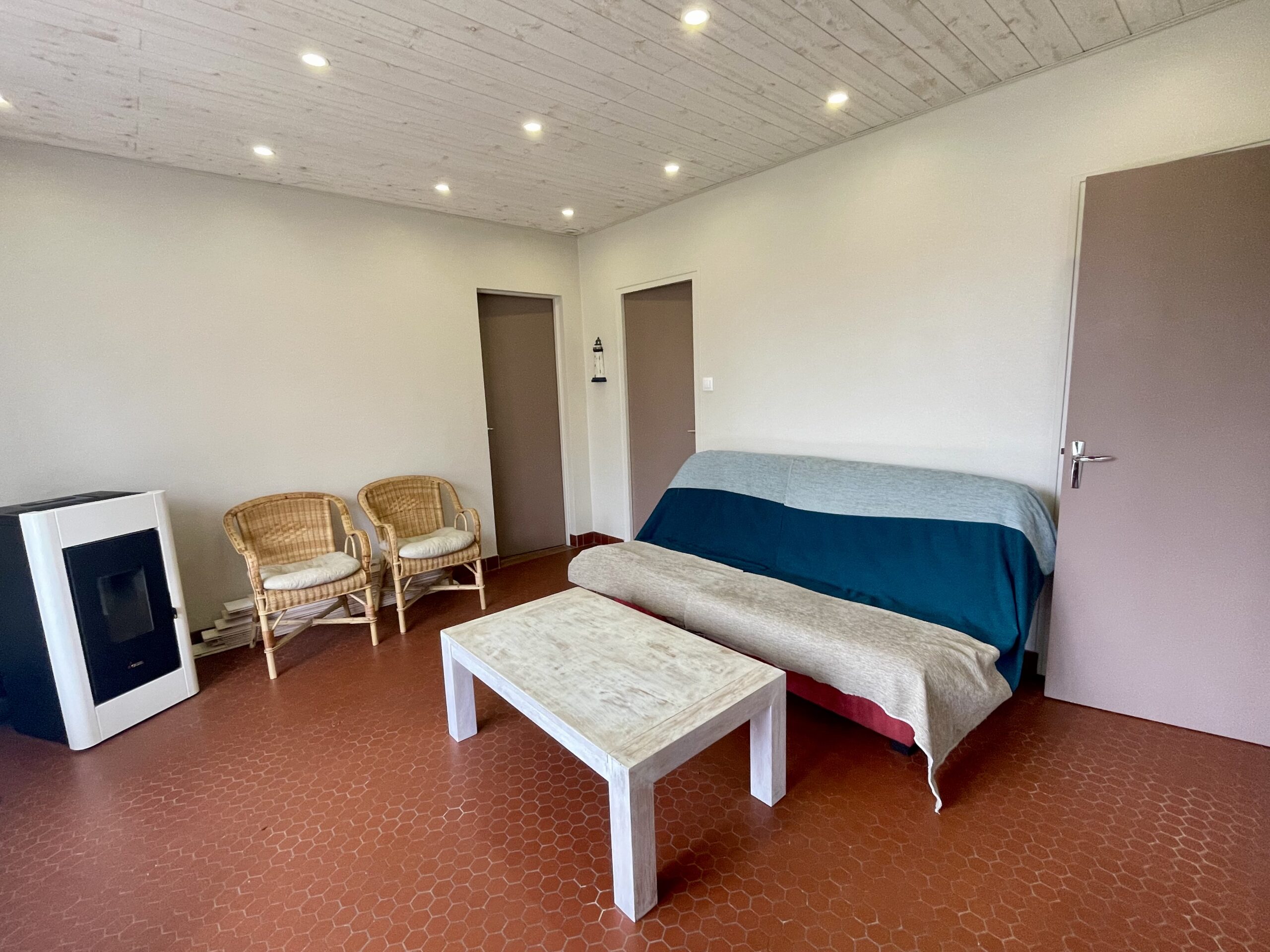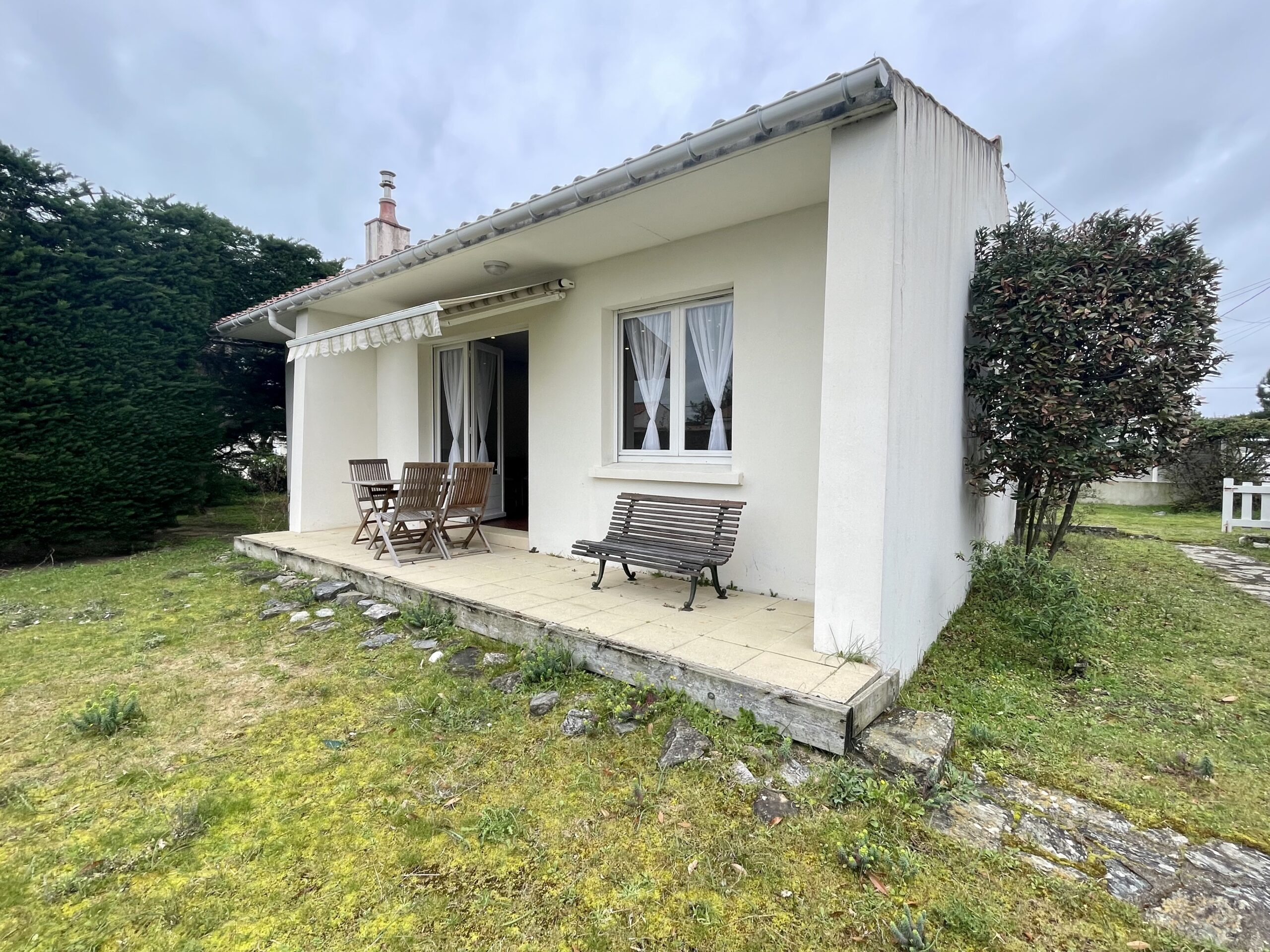 La pièce de vie ouvre sur une terrasse avec salon de jardin + store banne et jardin clos.