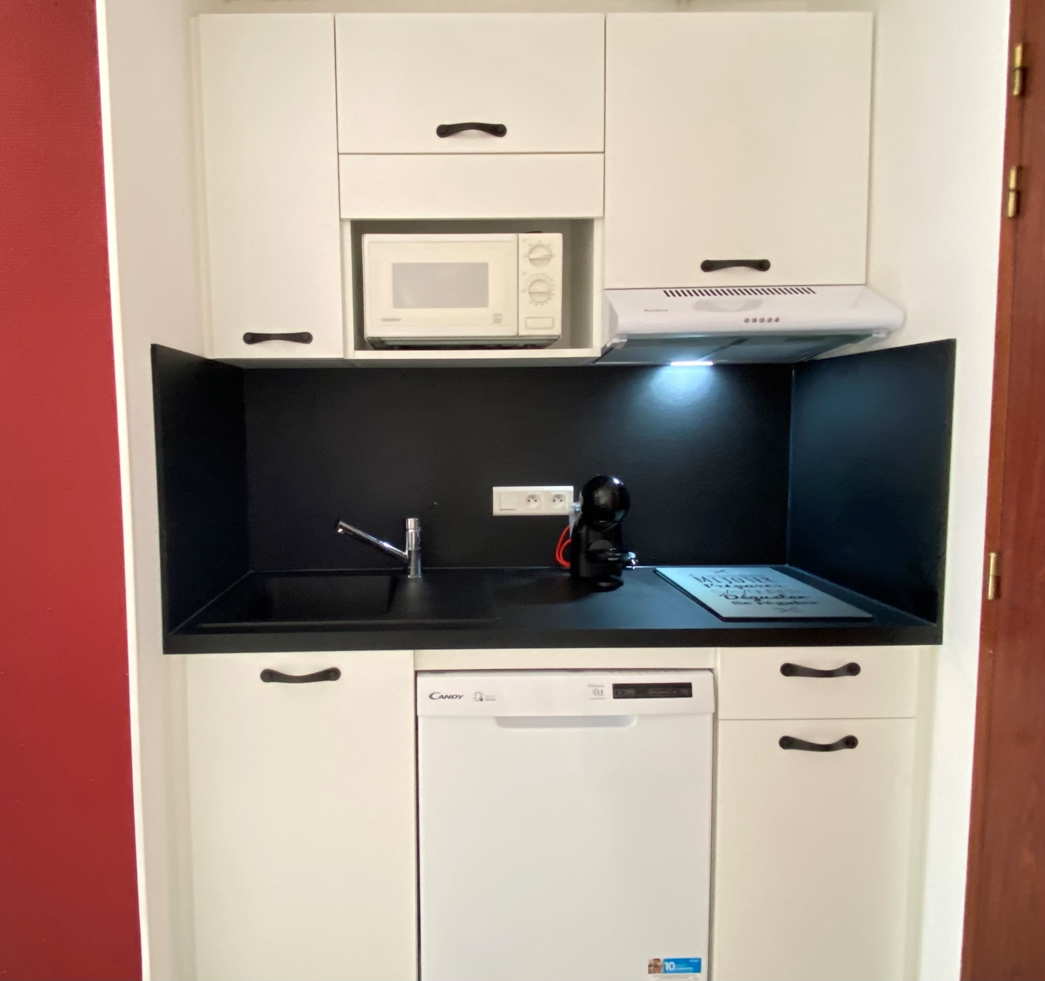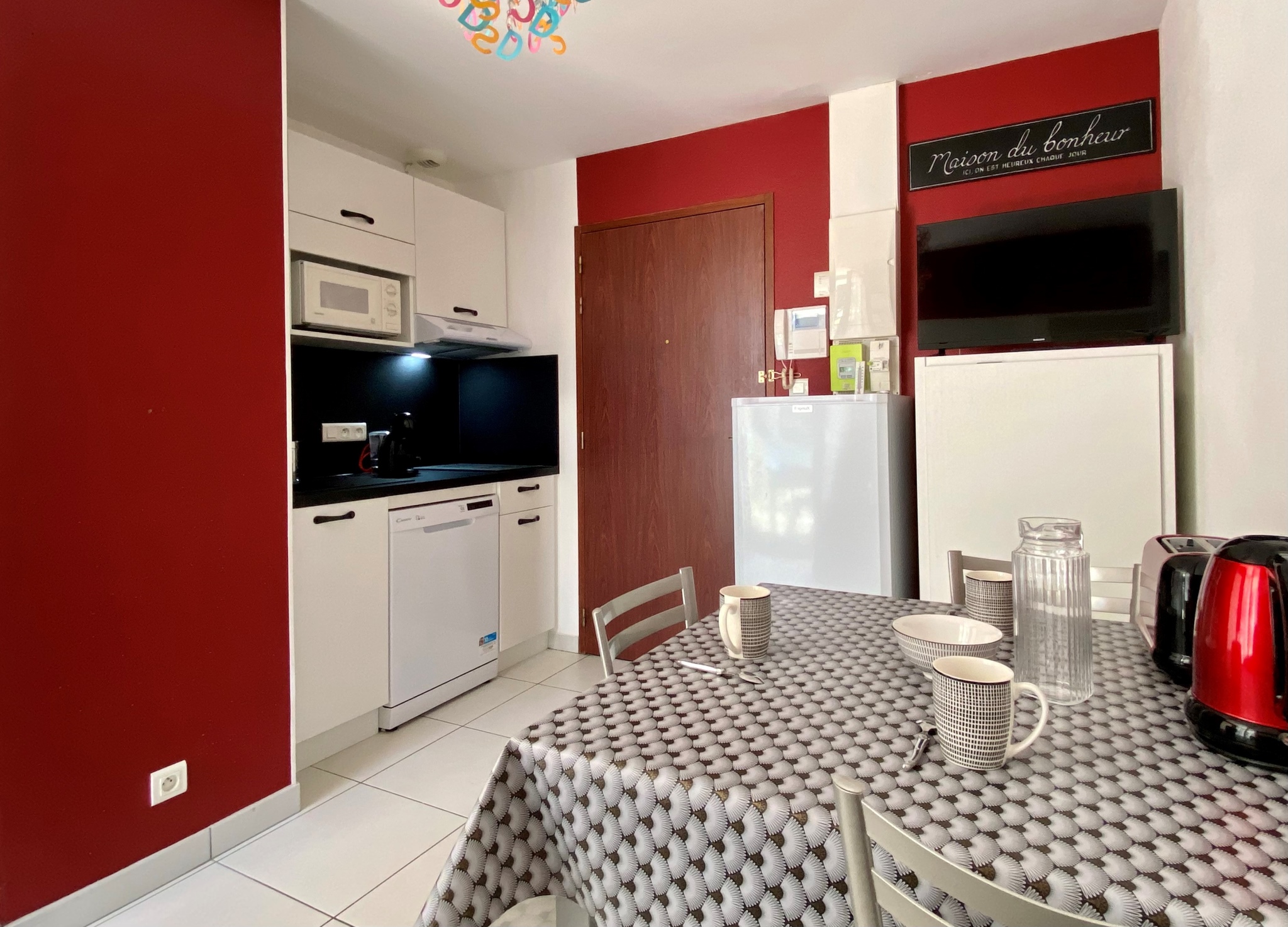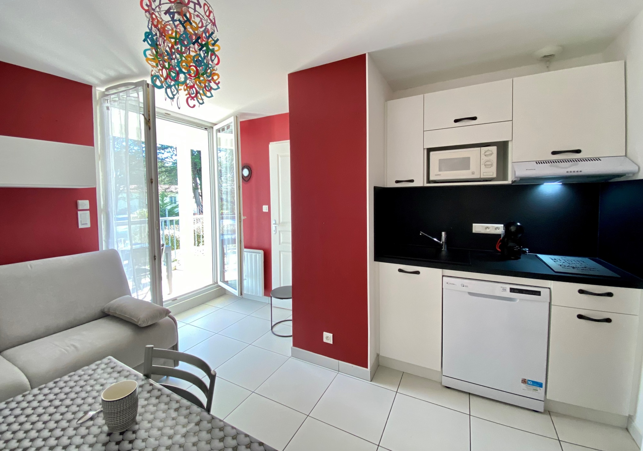 Il se situe au rez-de-chaussée (accès par quelques marches ou ascenseur) et se compose d’une pièce principale avec coin cuisine équipée (2 plaques induction, micro-ondes, hotte, lave-vaisselle, réfrigérateur avec partie freezer), espace repas (table+chaises) ainsi qu’un canapé + TV.