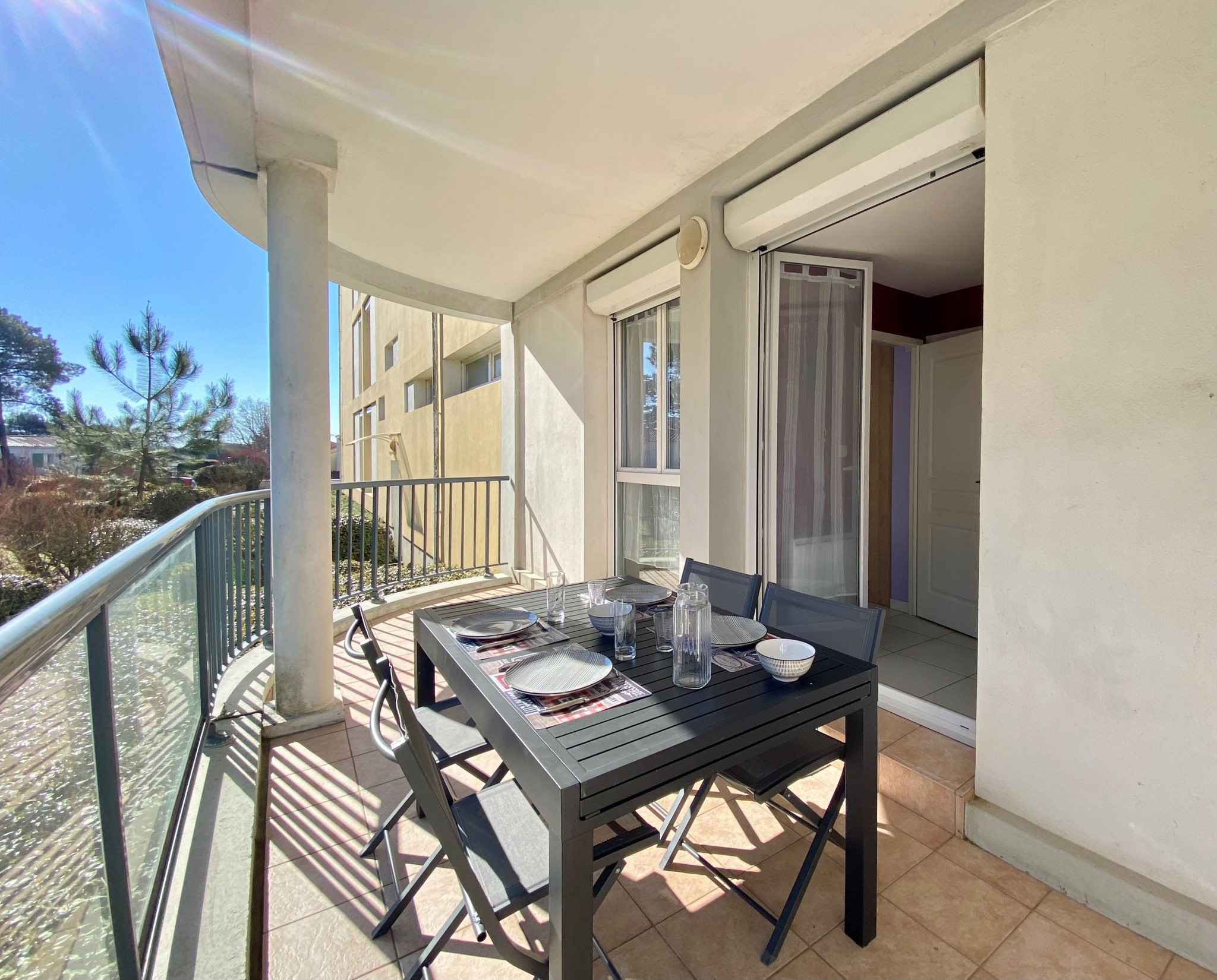 La pièce ouvre sur un grand balcon de 12m² avec salon de jardin.