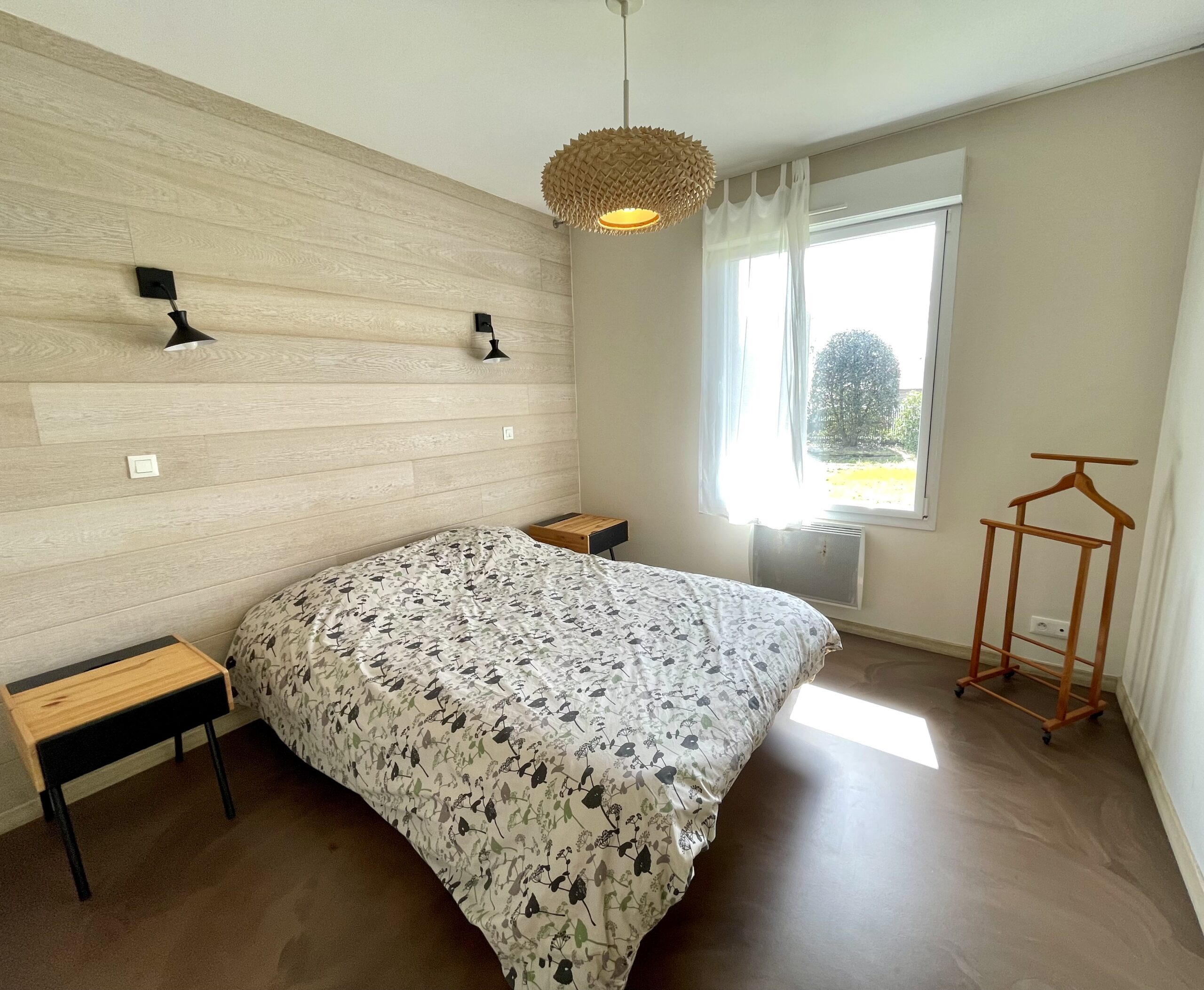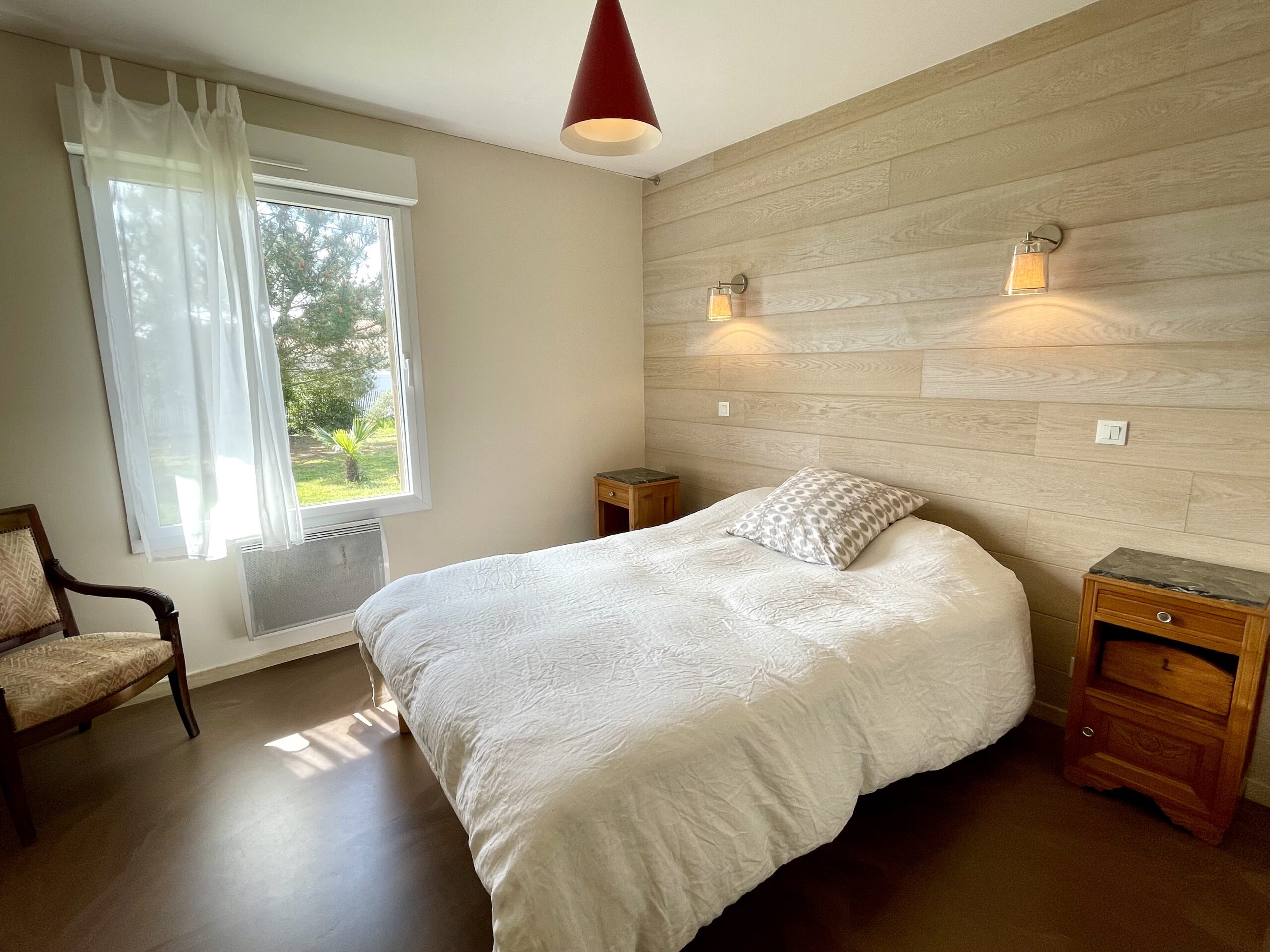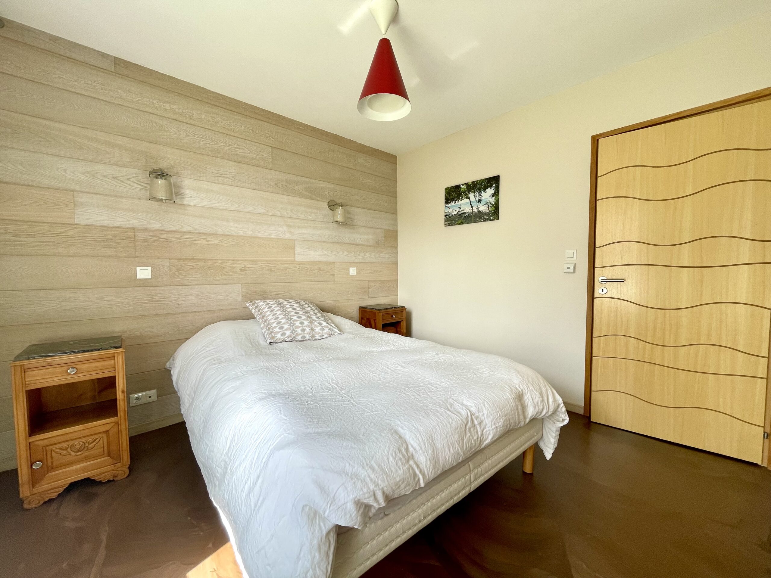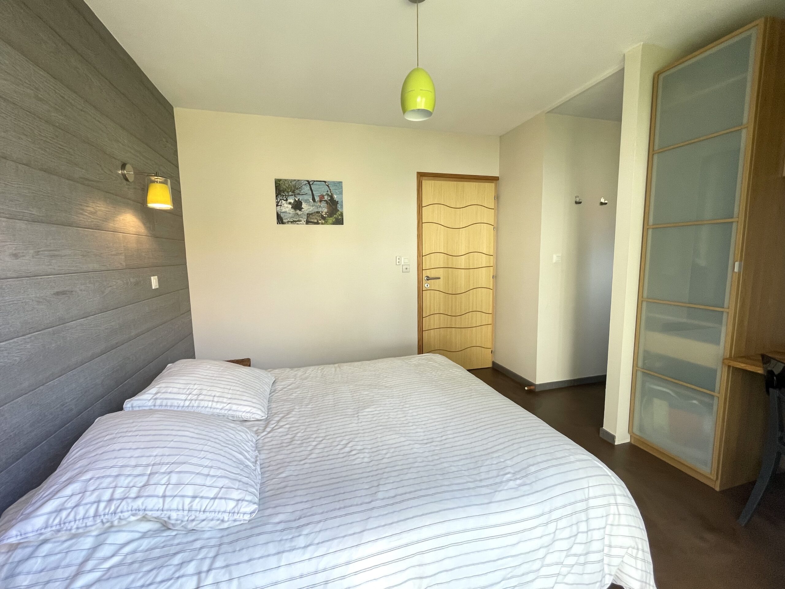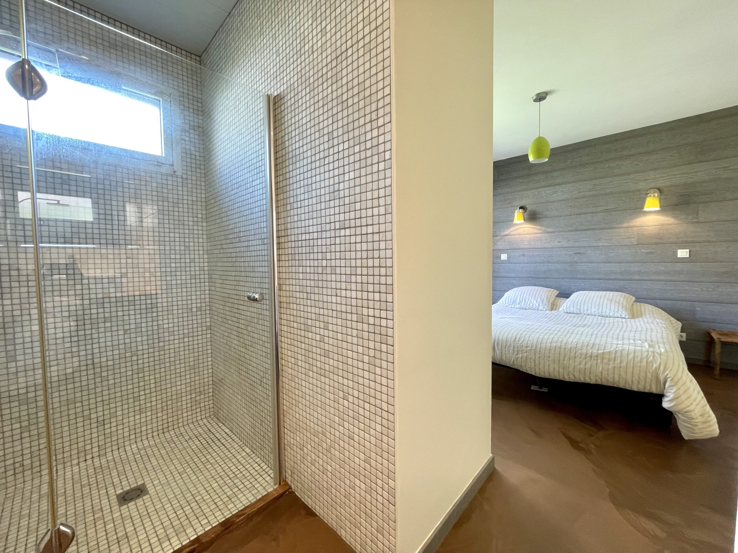 Chambre n° 1 de type « suite parentale »: 1 lit double (160), chevets, placard et salle d’eau attenante (douche à l’italienne, meuble vasque et sèche serviette).