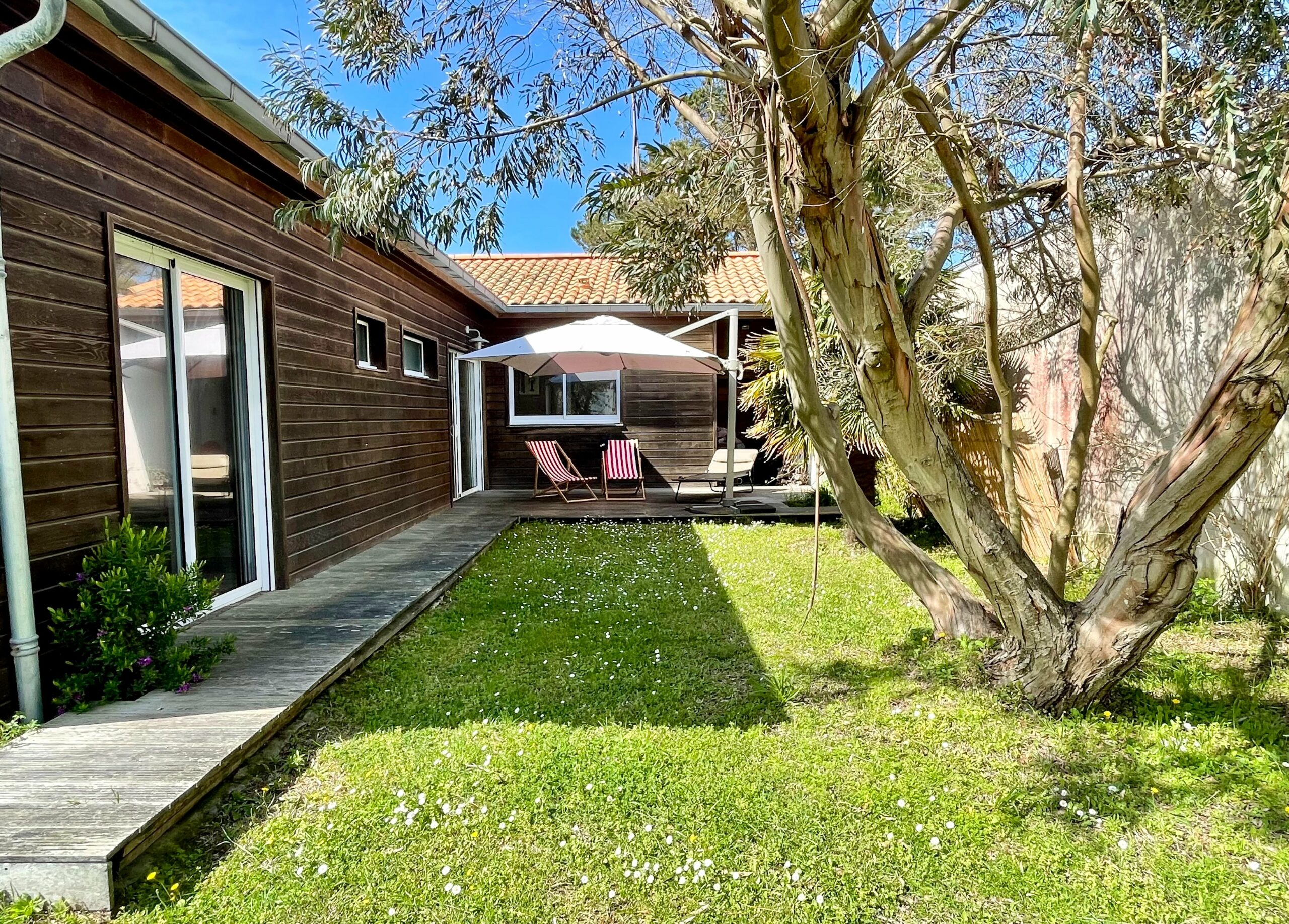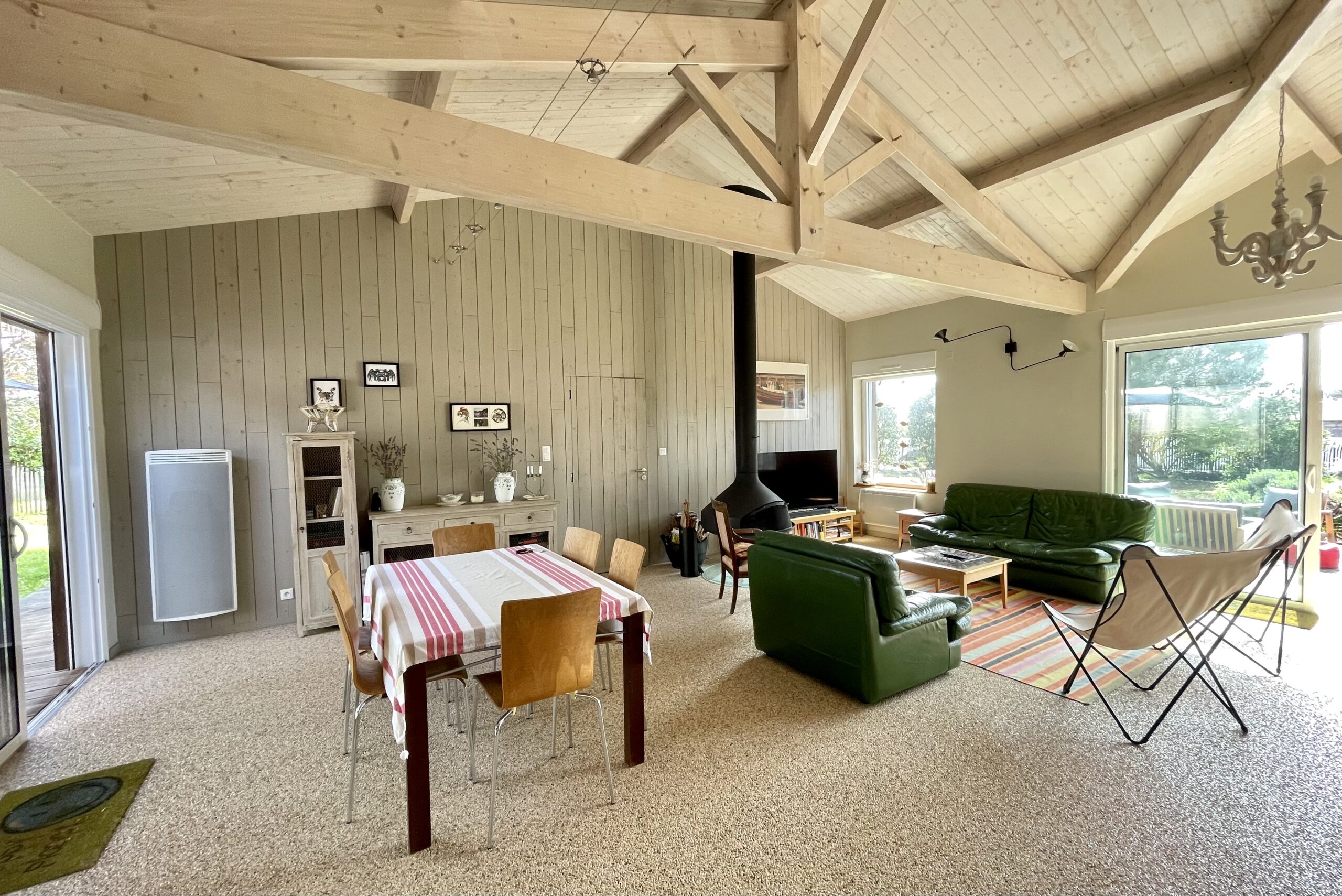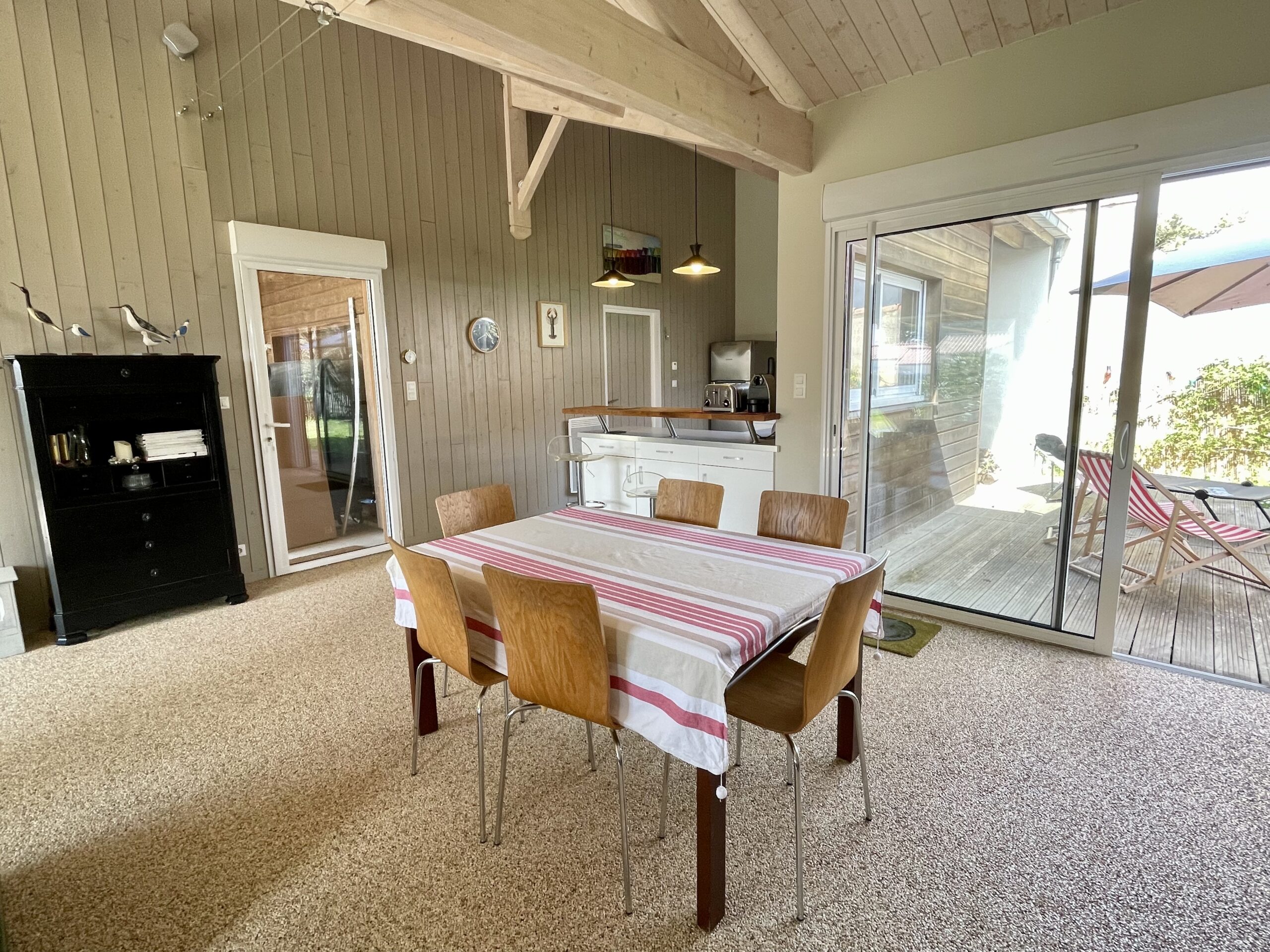 La pièce de vie est traversante et ouvre sur une terrasse bois sur l’avant de la maison et une autre terrasse sur l’arrière (table, chaises, barbecue, parasol et salon détente).