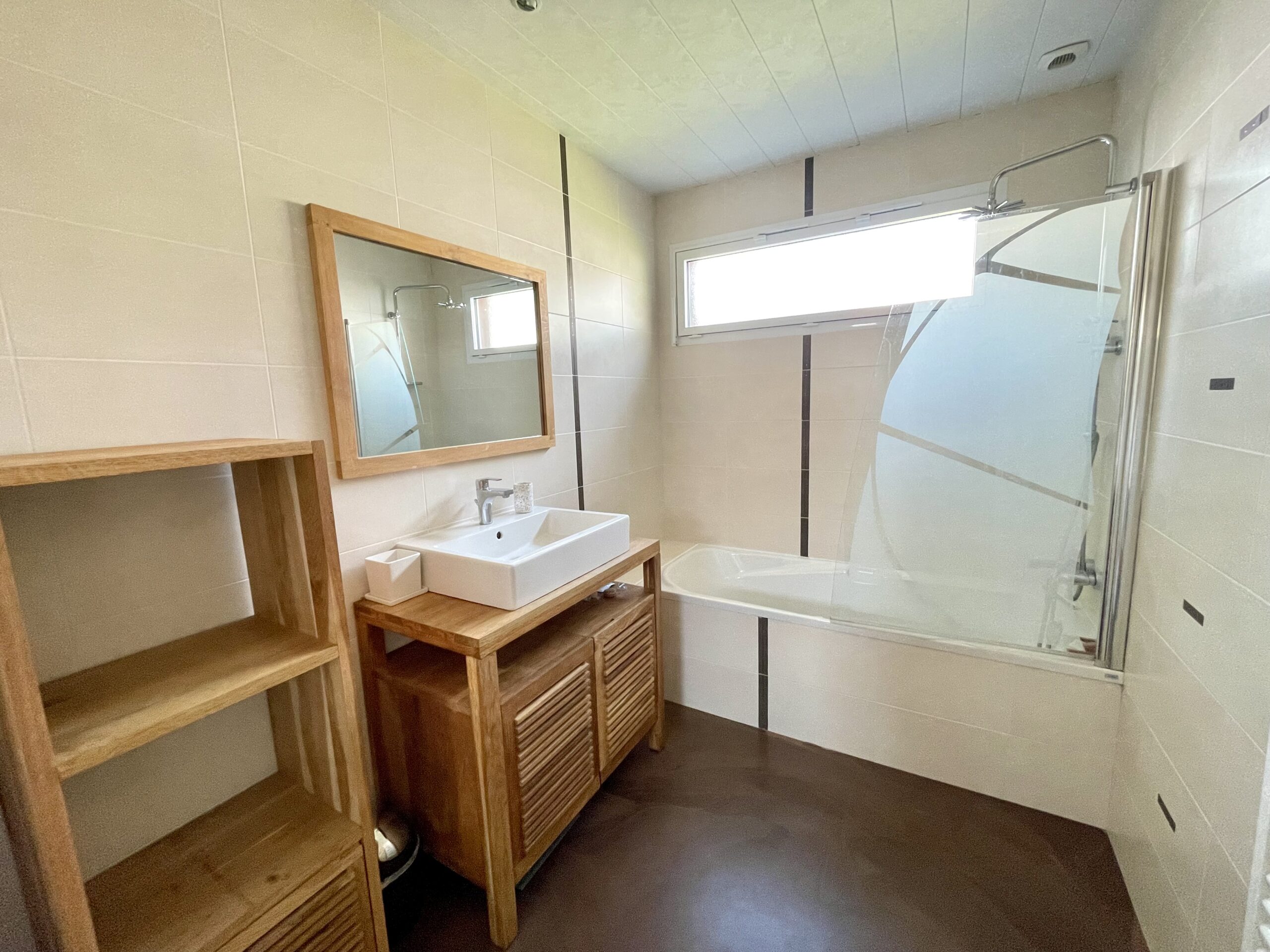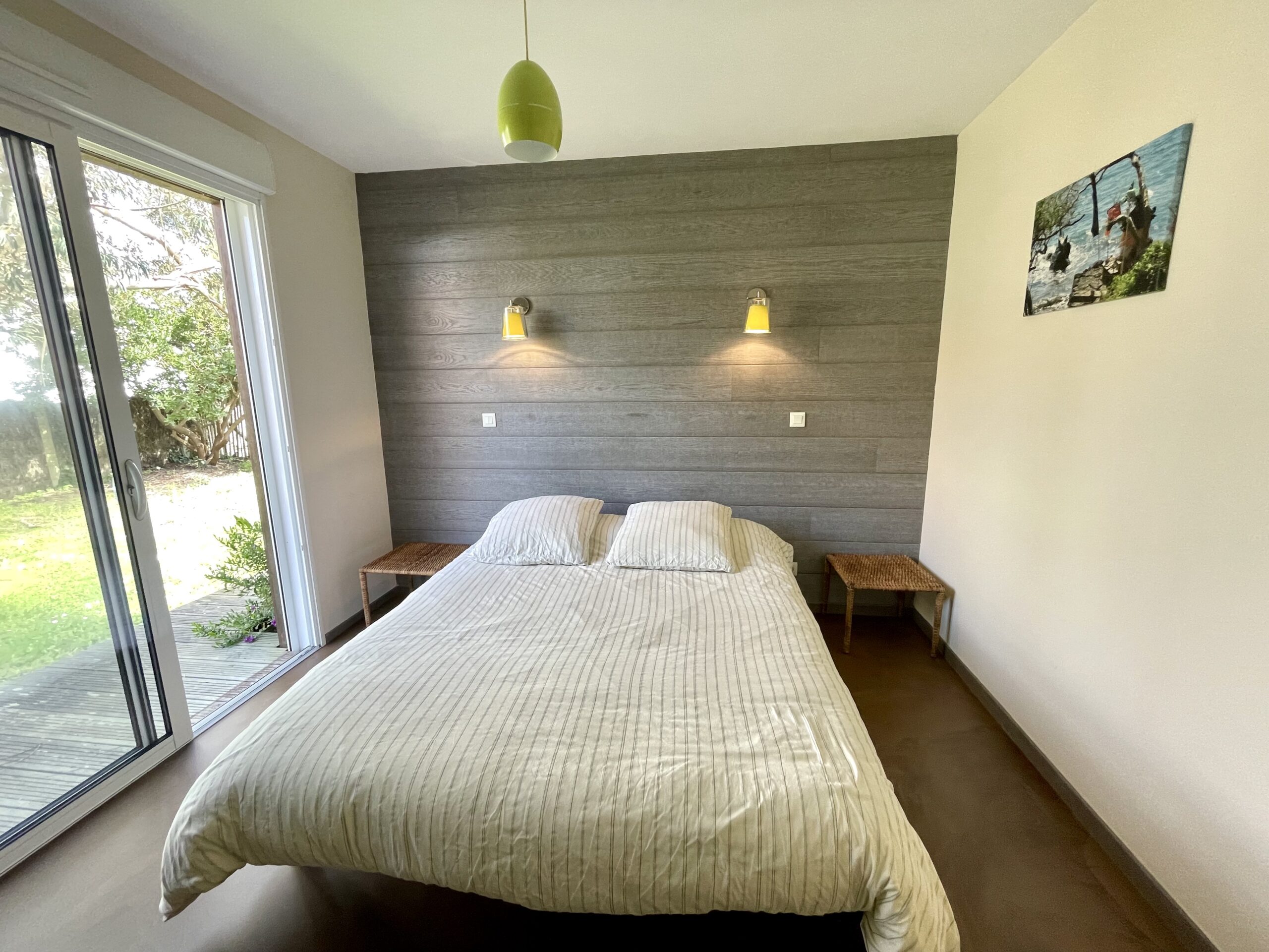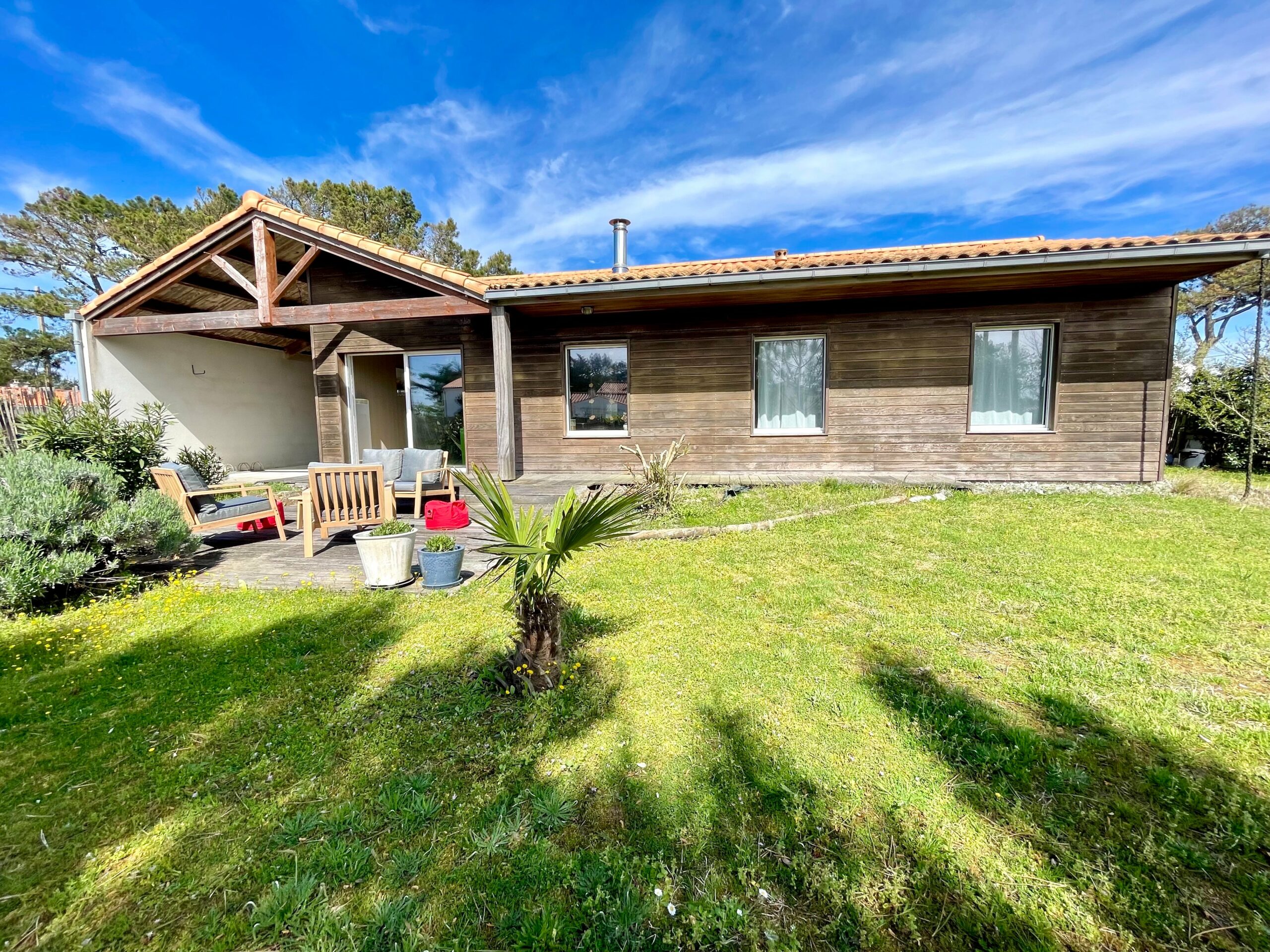 La pièce de vie est traversante et ouvre sur une terrasse bois sur l’avant de la maison et une autre terrasse sur l’arrière (table, chaises, barbecue, parasol et salon détente).