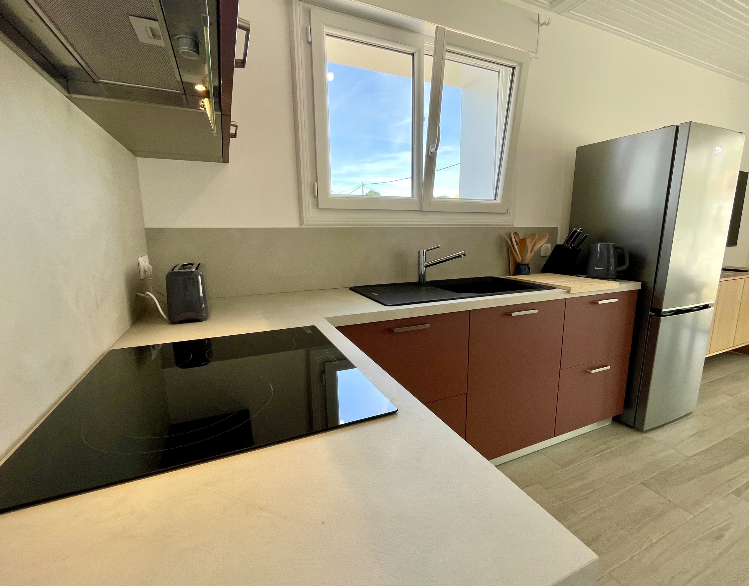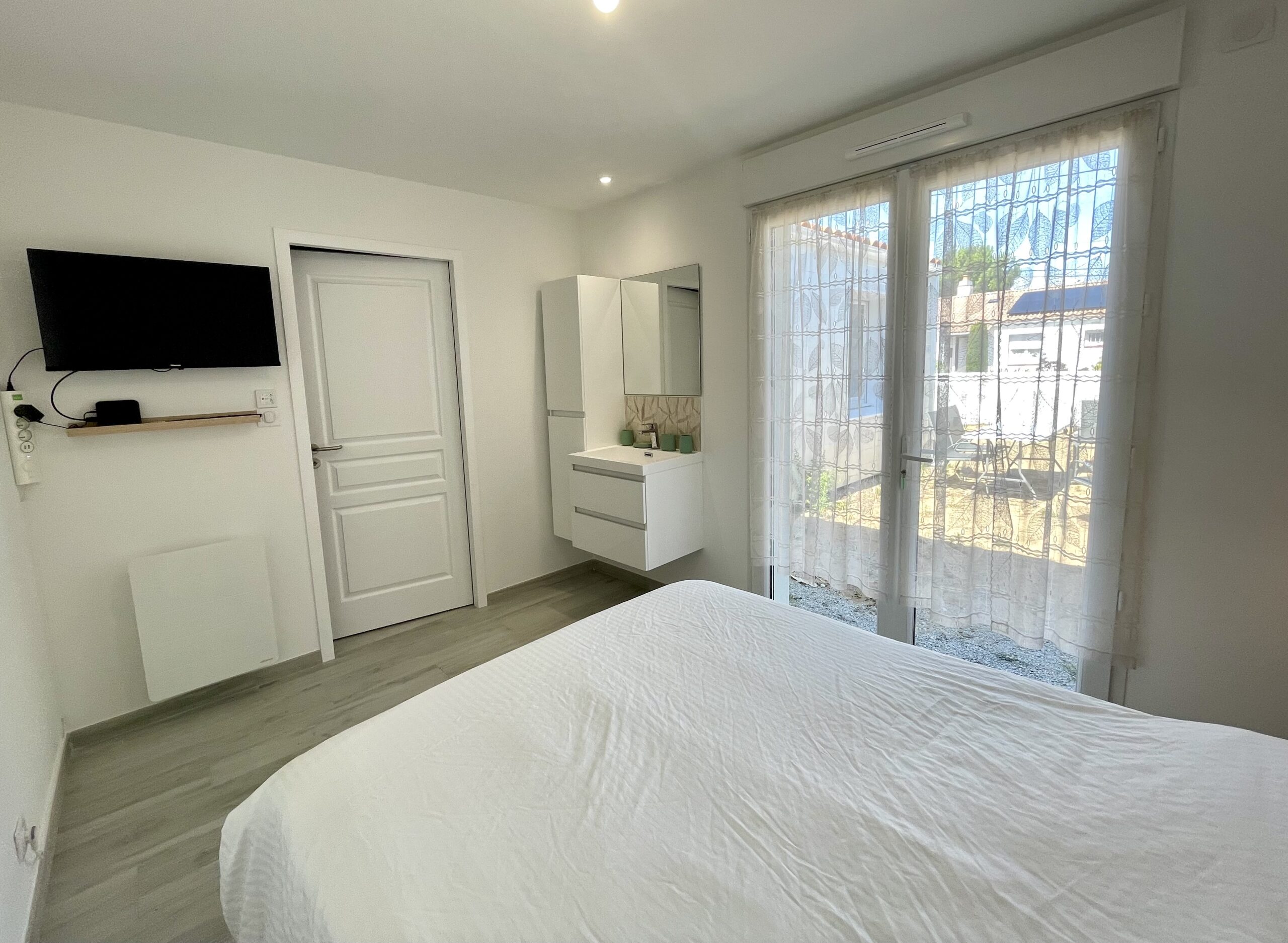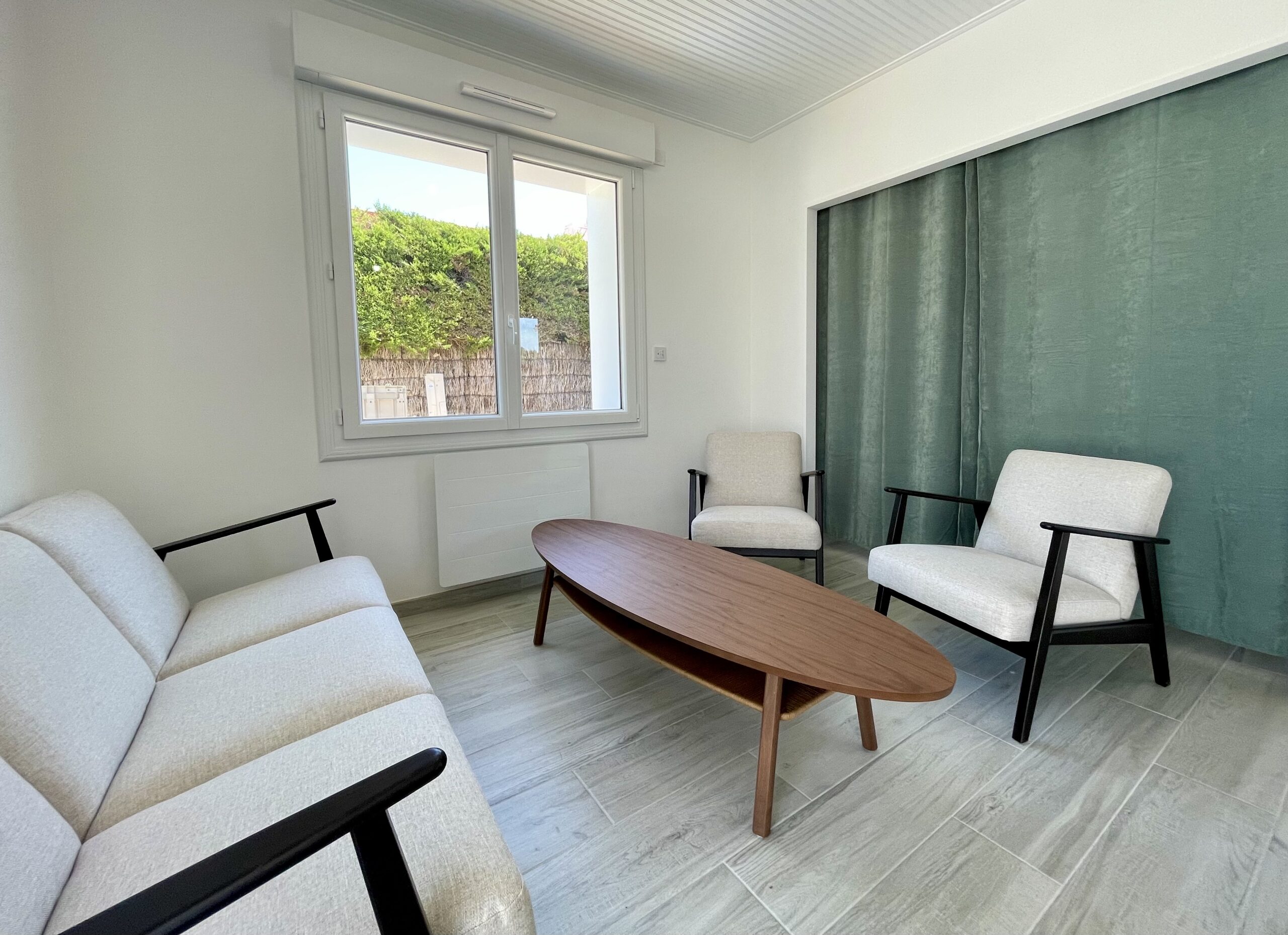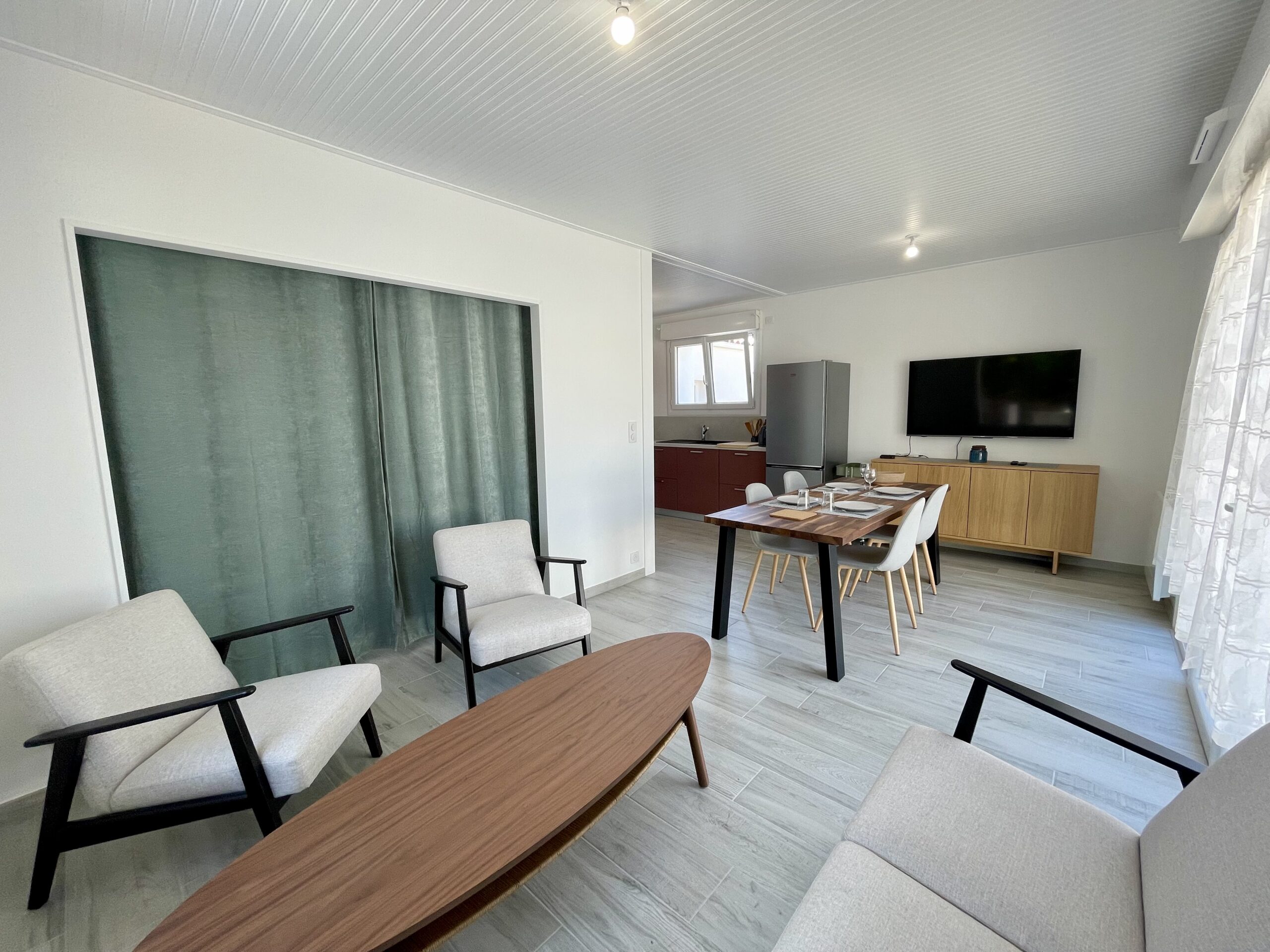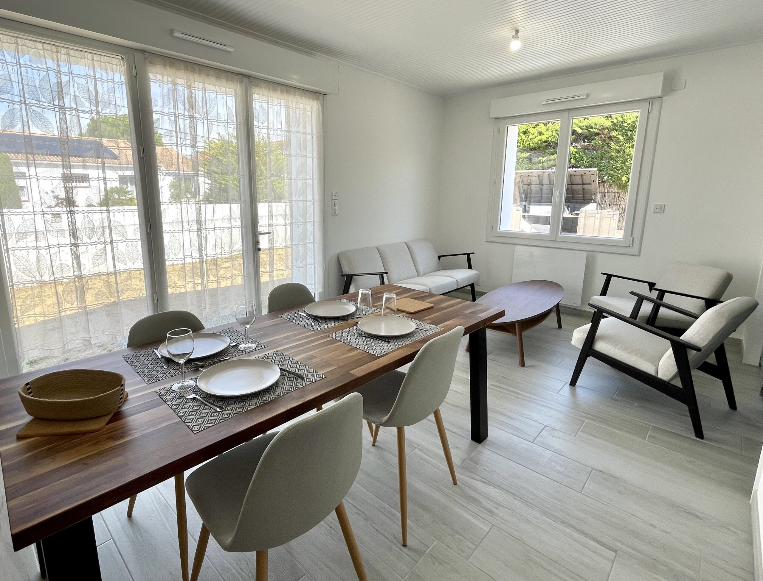 Idéalement située à mi-chemin du bord de mer et du centre ville et au sein d’un quartier résidentiel calme, jolie maison de 59m² de plain pied entièrement rénovée.