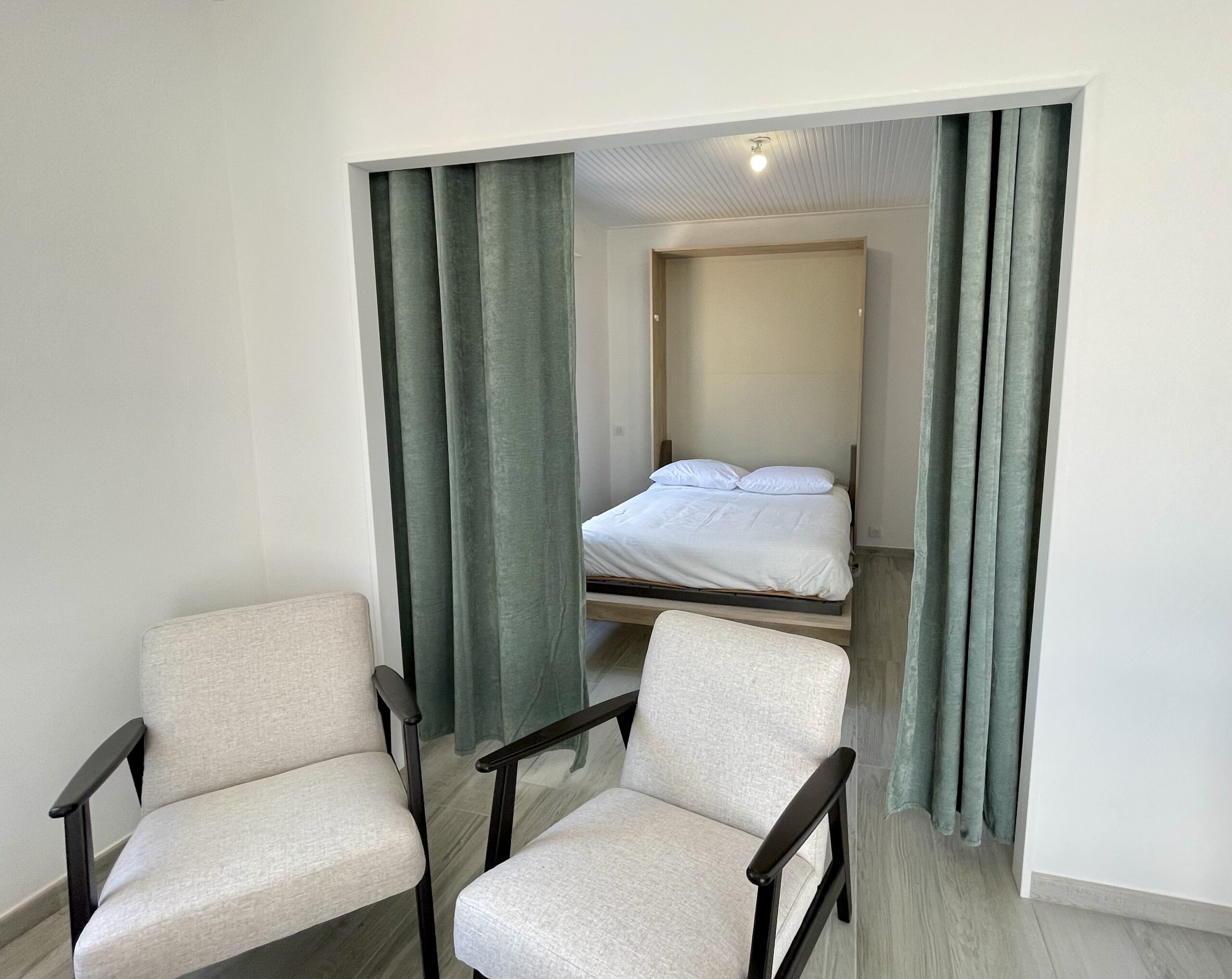 Depuis le salon, on accède à une chambre alcôve (fermée par un rideau): un lit double (140) + rangements (accès possible également par une porte depuis l’entrée).