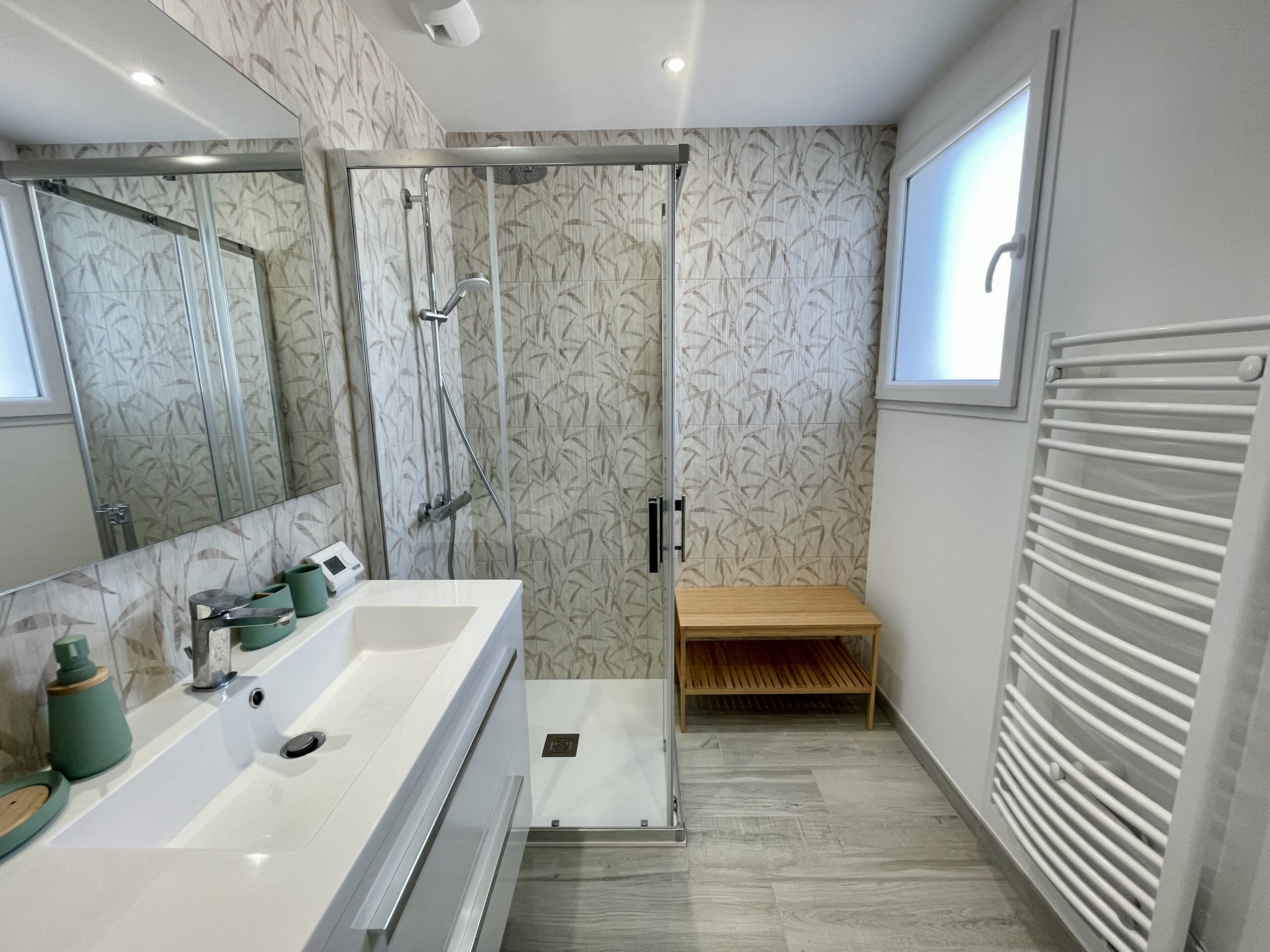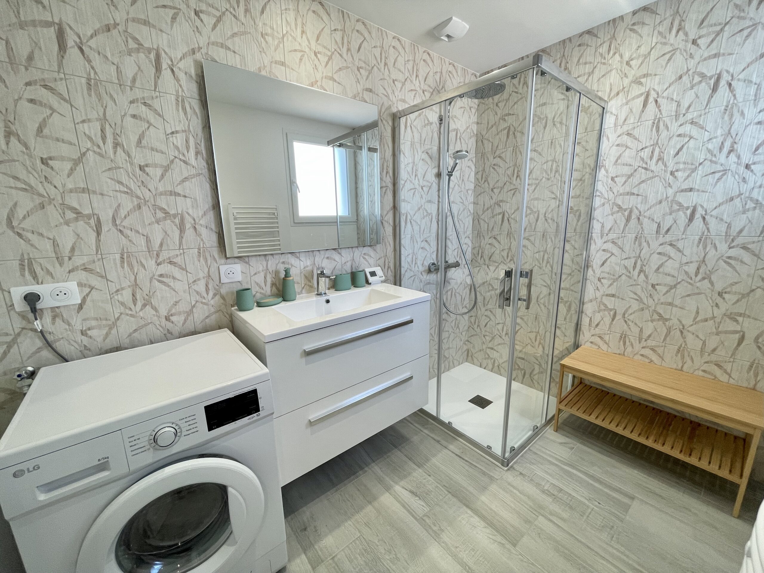 Depuis l’entrée, un dégagement dessert une seconde chambre, un toilette et la salle d’eau (douche, meuble vasque, sèche serviette et combiné lave-linge/sèche-linge).