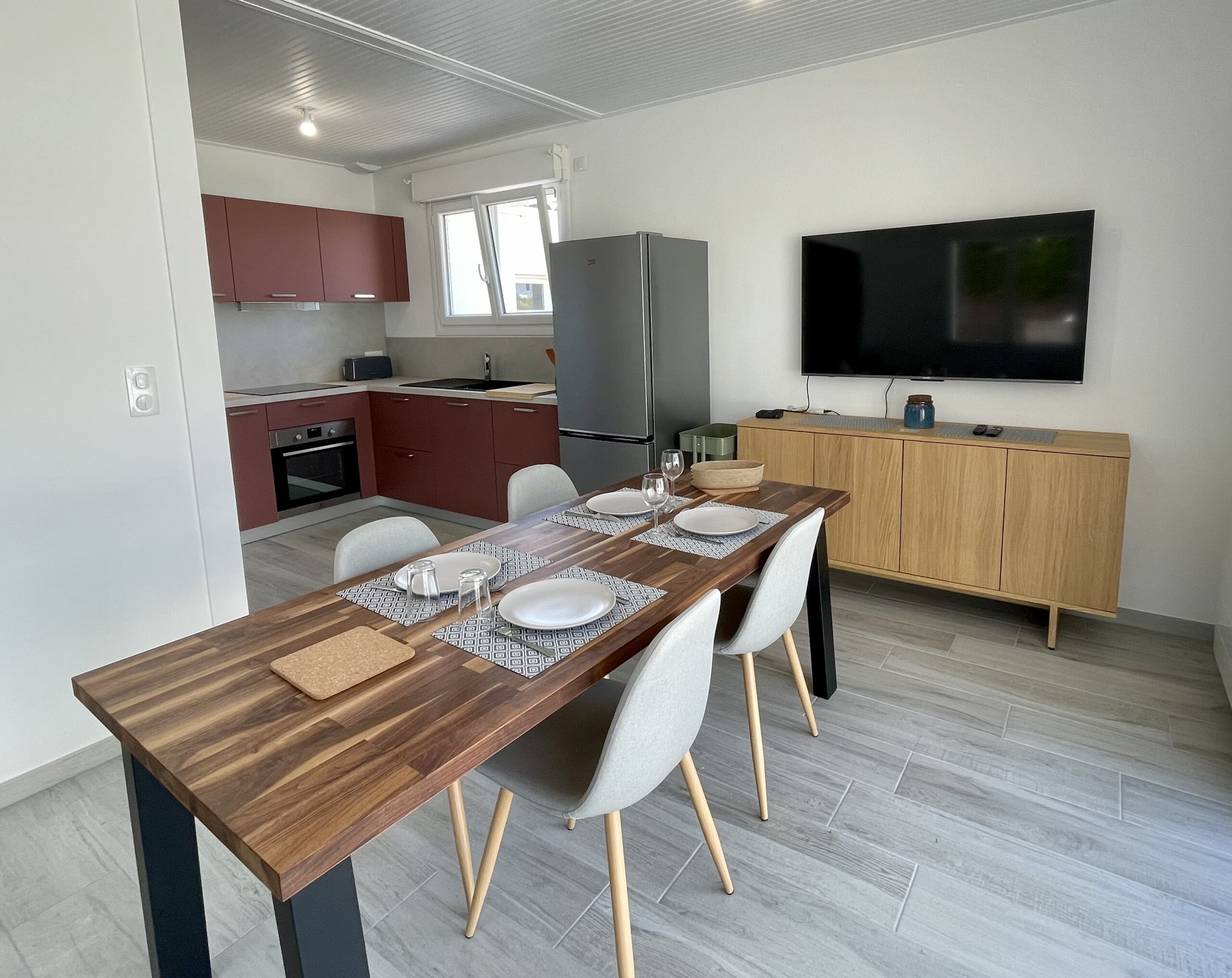Elle comprend une entrée qui dessert les différentes parties de la maison: une agréable pièce de vie avec une cuisine aménagée et équipée (plaque induction, hotte, four, micro-ondes, réfrigérateur avec partie congélateur, cafetière Nespresso) ouvre sur un coin repas (table, chaises, buffet) et un salon (canapé, 2 fauteuils, table basse, grande TV écran plat).
