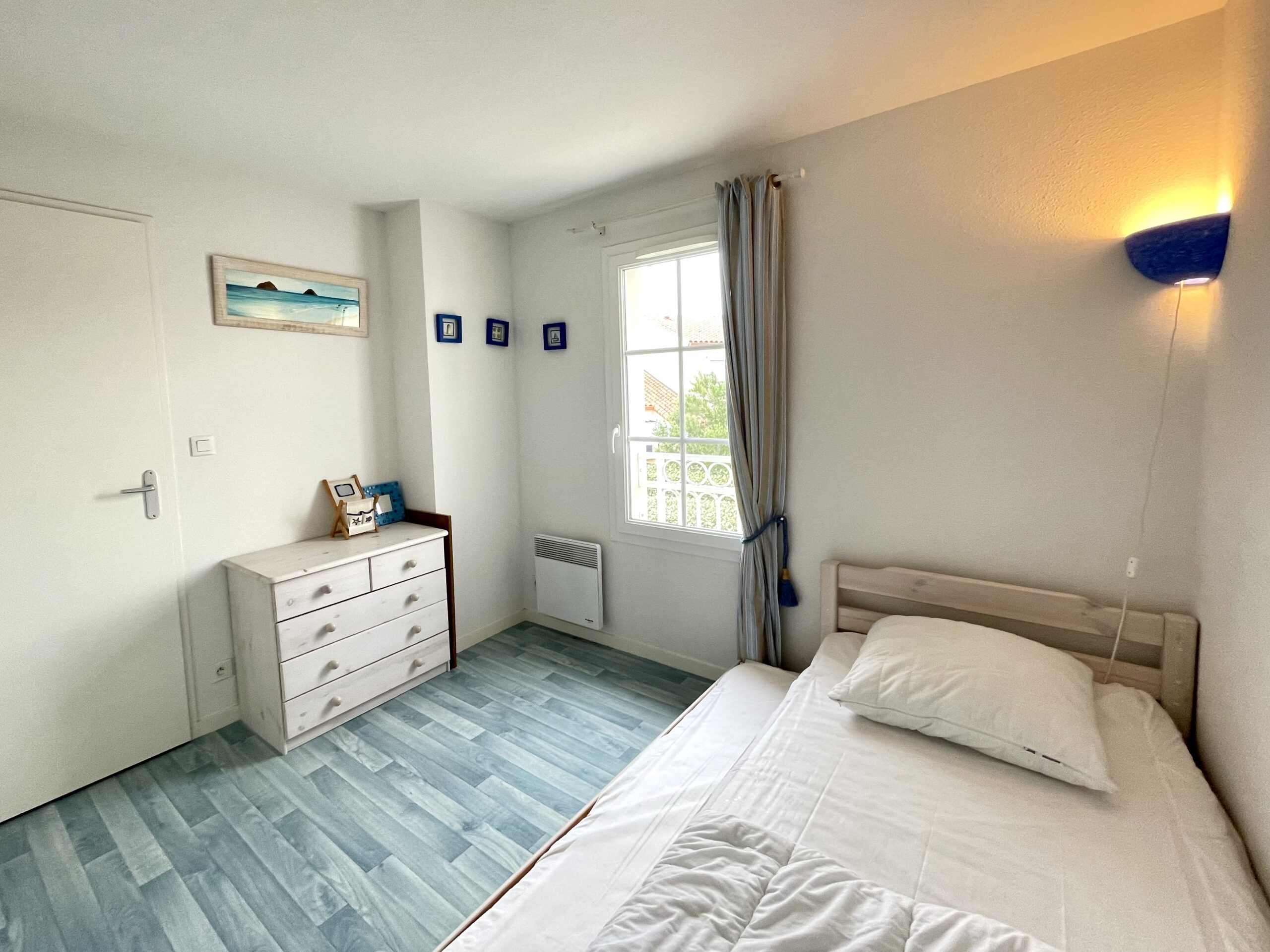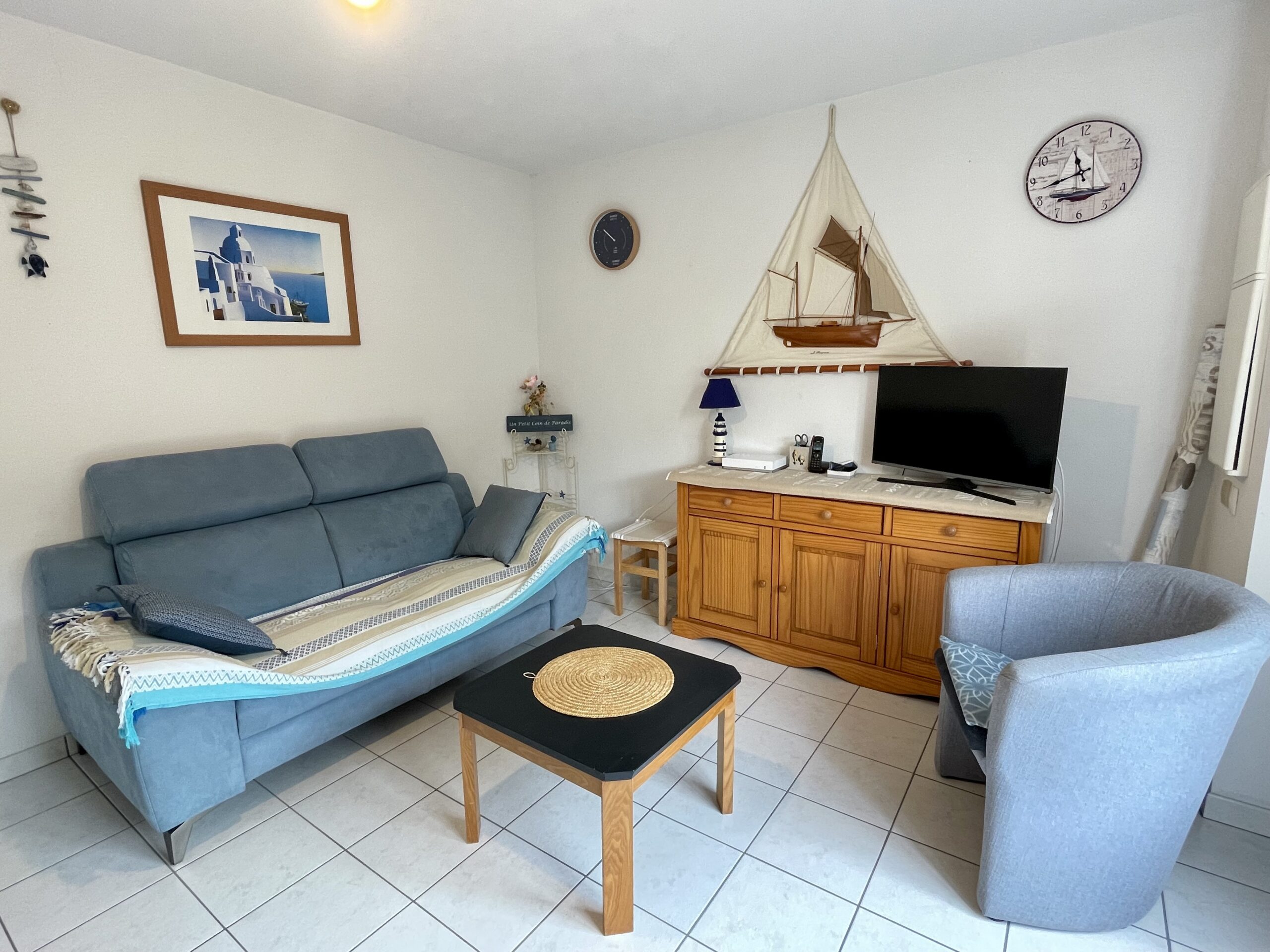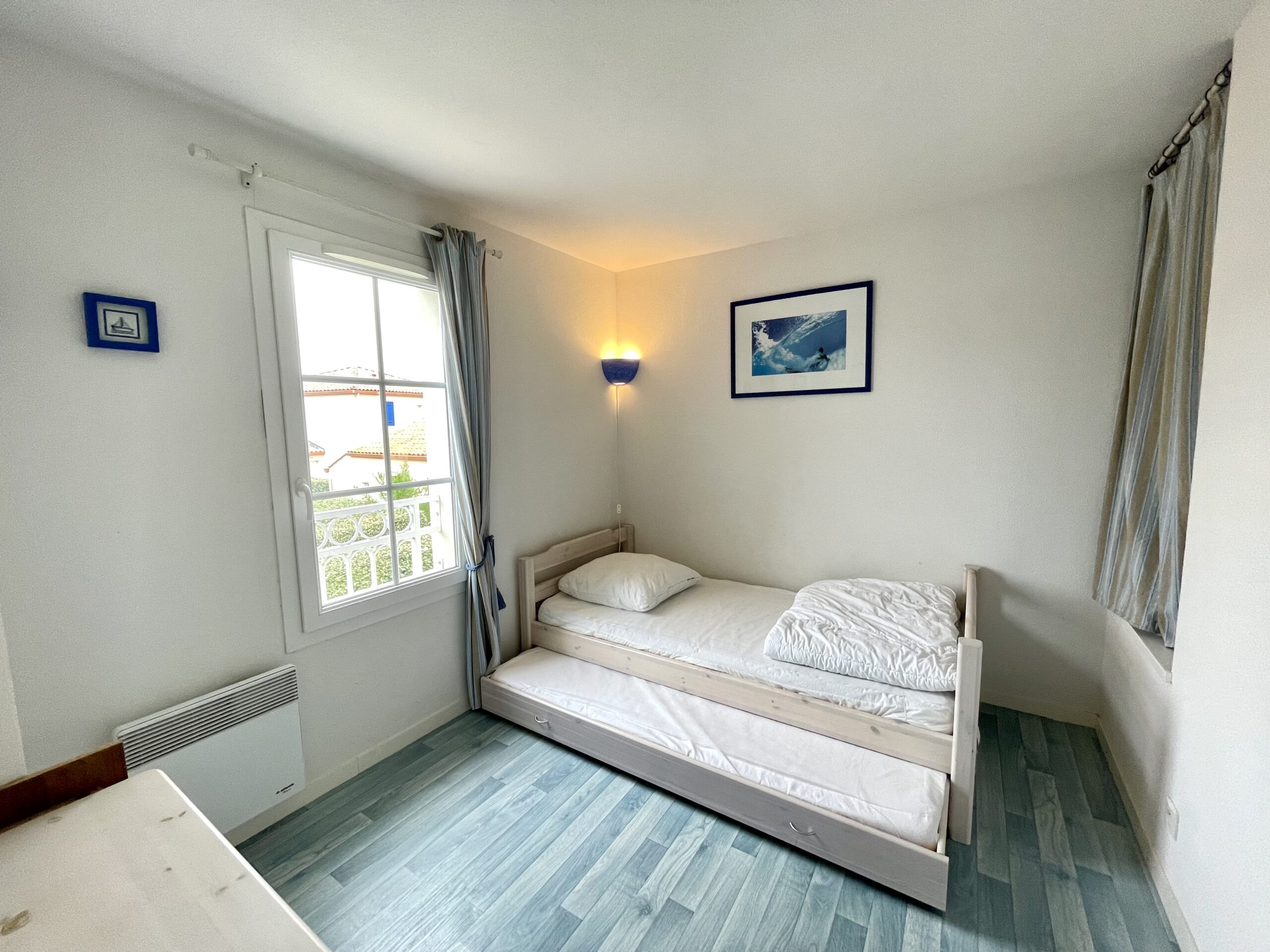 A 150m de la plage, commerces et animations de la Parée, au sein d’une résidence avec piscine collective non chauffée (ouverte de mi-juin à mi-septembre), maison de type 3 étage comprenant une entrée, wc, une pièce de vie avec coin repos (canapé, buffet, table basse, TV), coin repas (table, 4 chaises) et cuisine (plaque 4 feux électriques, réfrigérateur-congélateur, mini-four, micro-ondes, lave-vaisselle…).